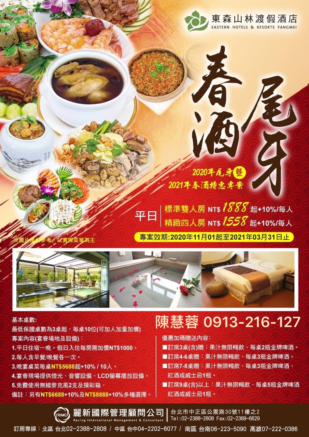 二、 東森山林渡假酒店推出優惠加碼贈送,詳情請參閱附件。專案聯絡人:陳慧蓉電話:0913-216-127。