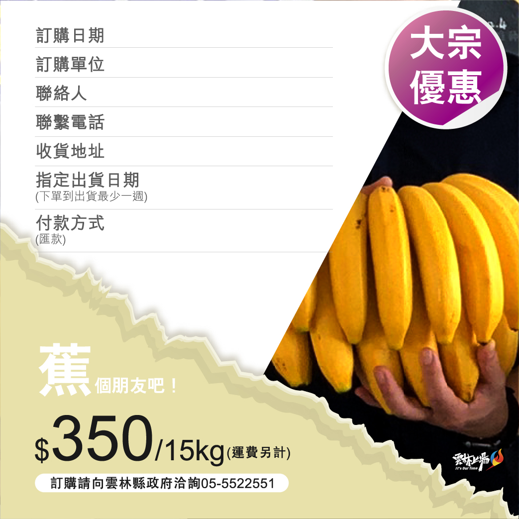 本合作社轉登雲林縣政府函以;時值本縣香蕉產季、價格實惠、香甜好吃,正是品嚐的好時機,本府整合轄內農民團體提供優惠訂購方案,歡迎各位同仁支持選購。如有要訂購同仁,詳情請參酌附件訂購單。