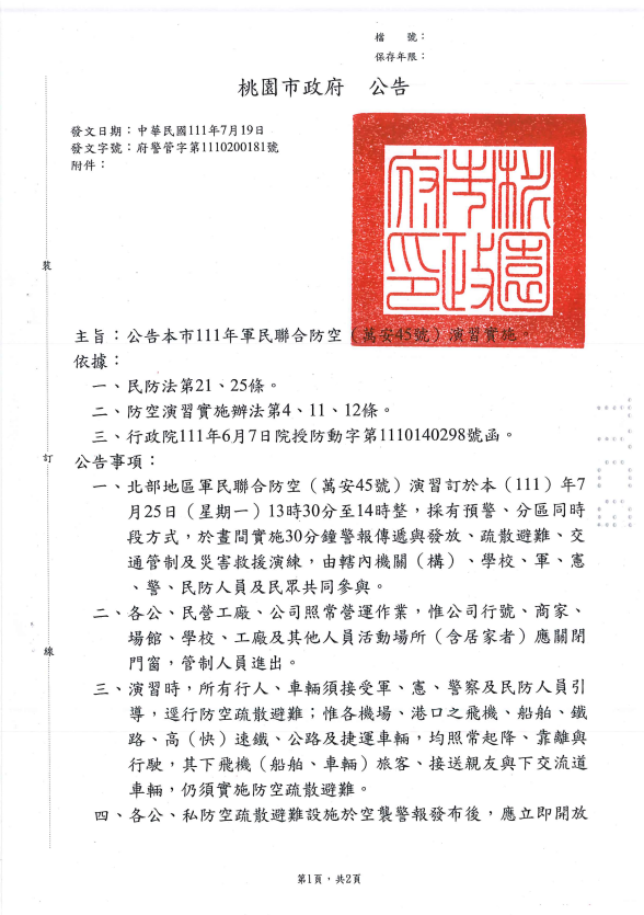 發佈者: 廖明珠萬安45號演習訂於本(111)年7月25日(星期一)實施,由安管中心下午13 時 30 分配合演習發布緊急警報,14時發布解除警報,演習期間本所所區及中科院院區管制作為如下: