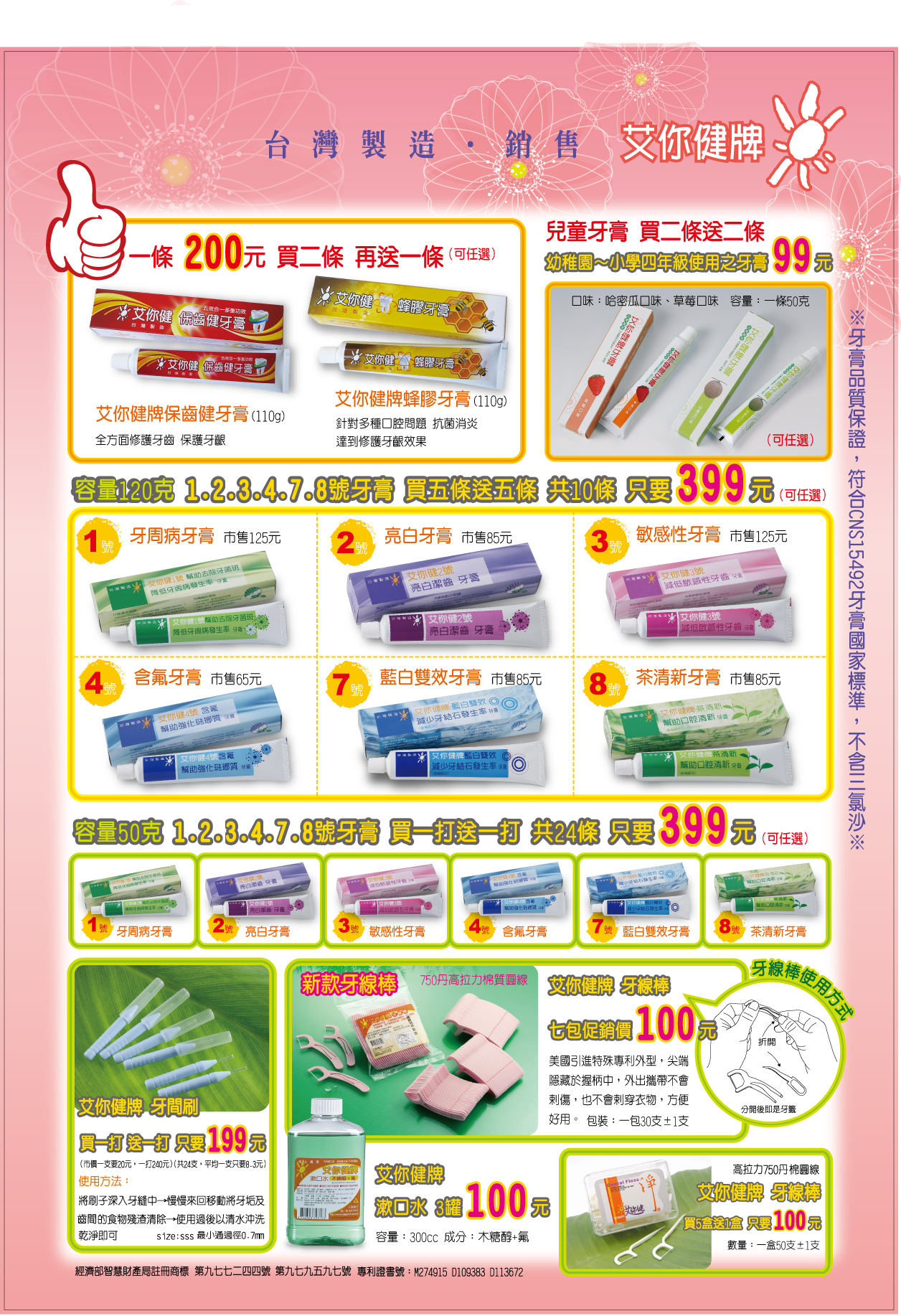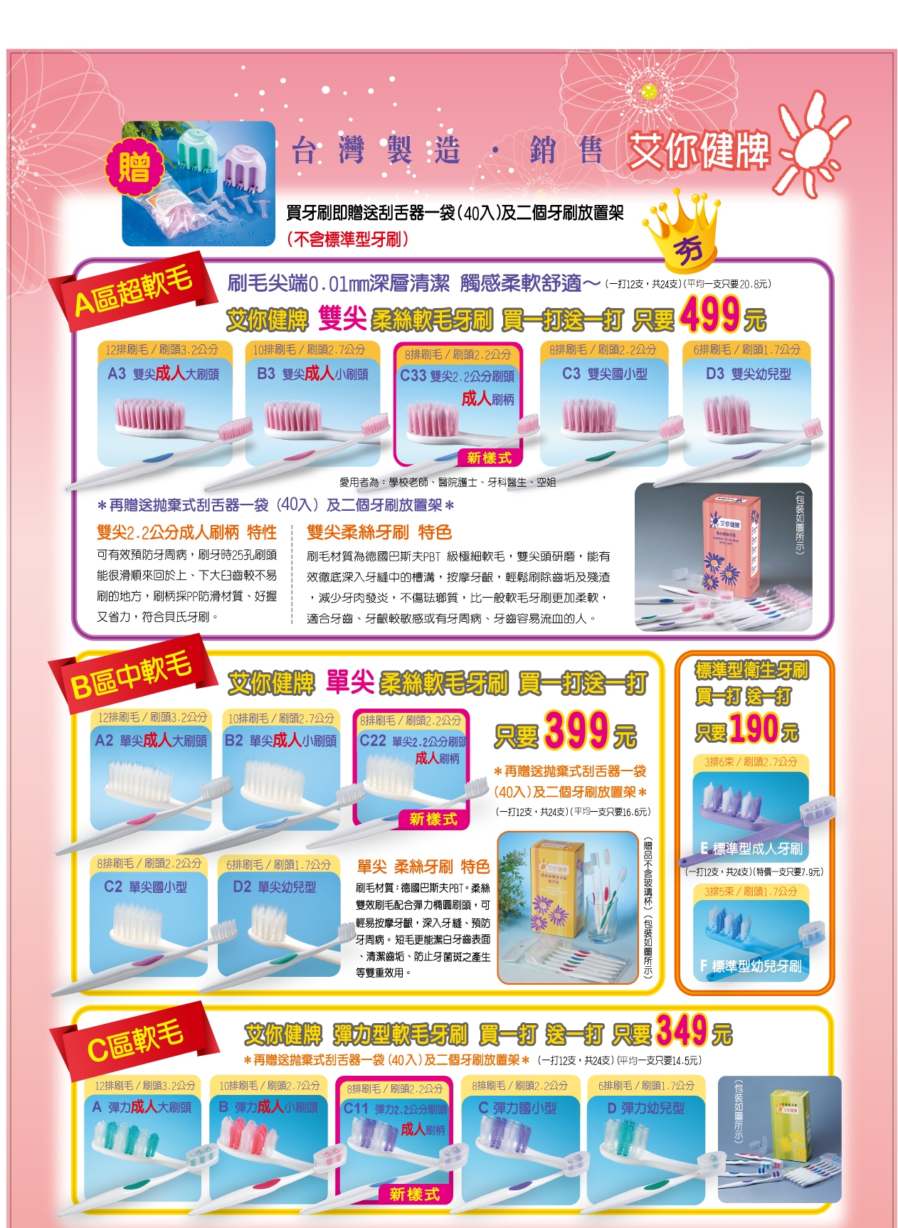 合作社代訂台灣製造-艾你健牌牙刷/膏/口腔保健系列商品,如有要訂購同仁請依附表格式填妥後至合作社登記一併繳款。