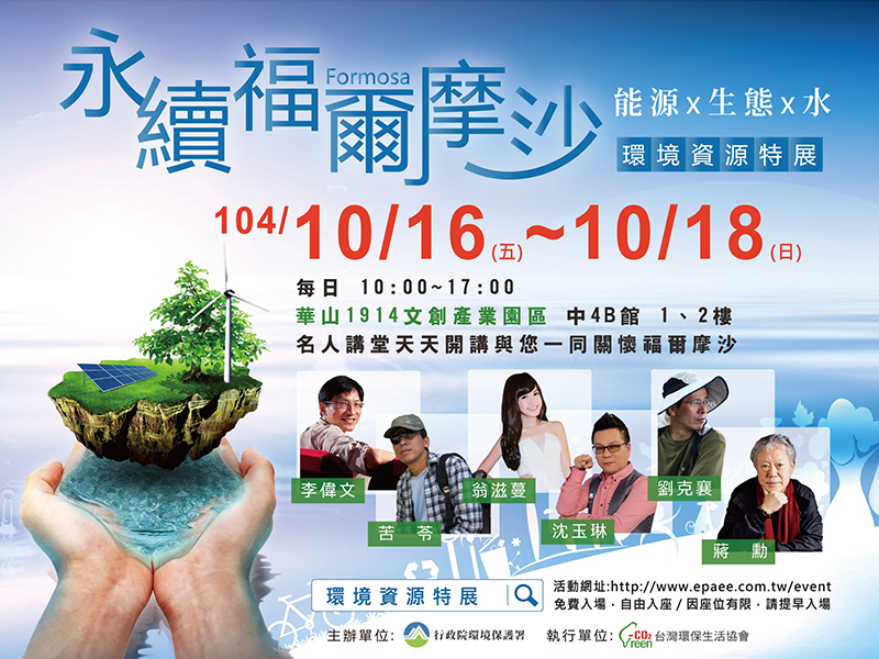行政院環境保護署訂於104年10月16日(五)至10月18日(日)假台北華山1914文創園區(臺北市中正區八德路一段1號)中4B館辦理『永續福爾摩沙 環境資源特展』,本所計四項產品參展,請同仁踴躍前往參觀。