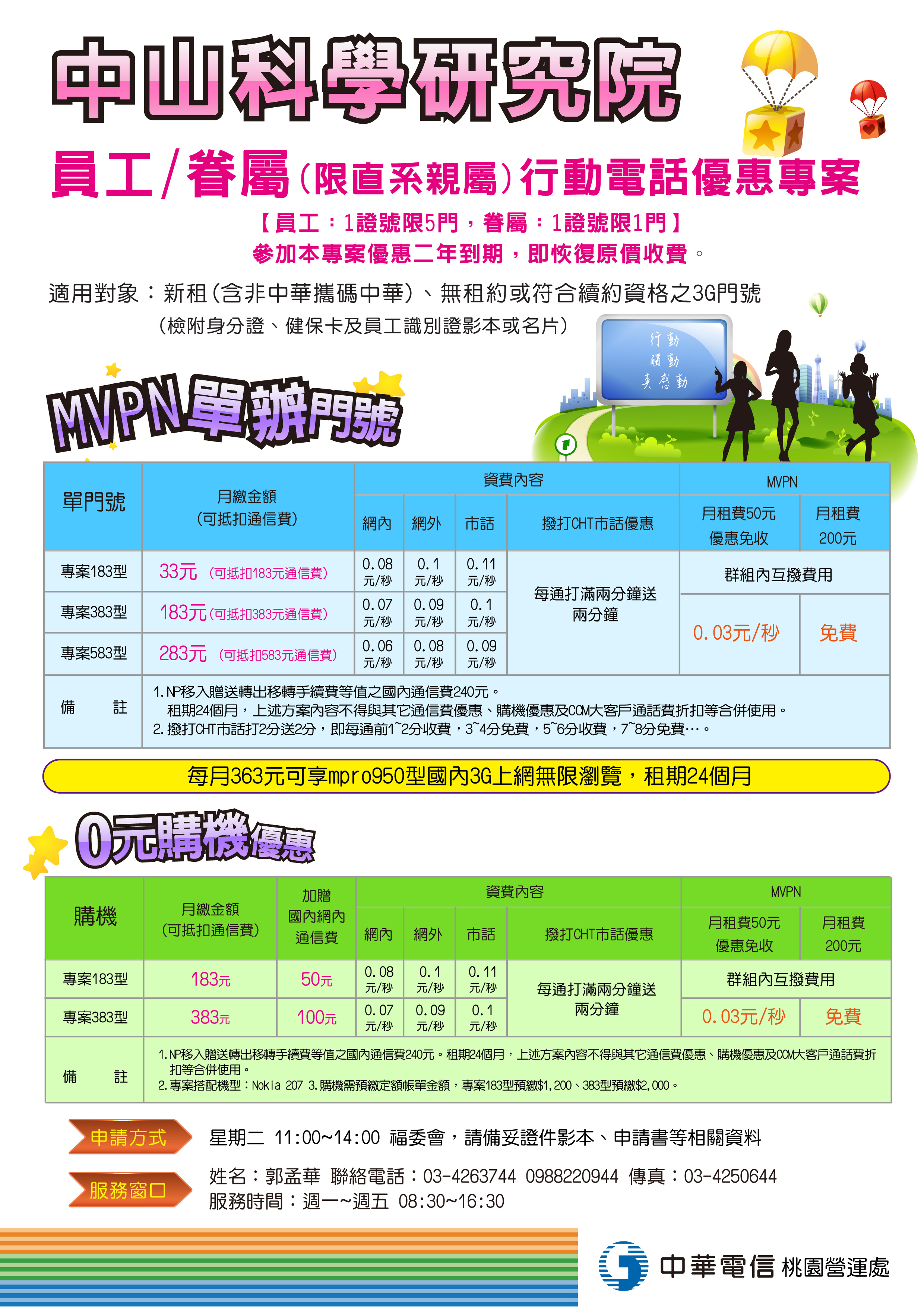 本合作社轉登中華電信行動電話中科院優惠專案相關資料)請同仁參閱!每週二中科院福委員會現場駐點服務AM11:00-PM2:00