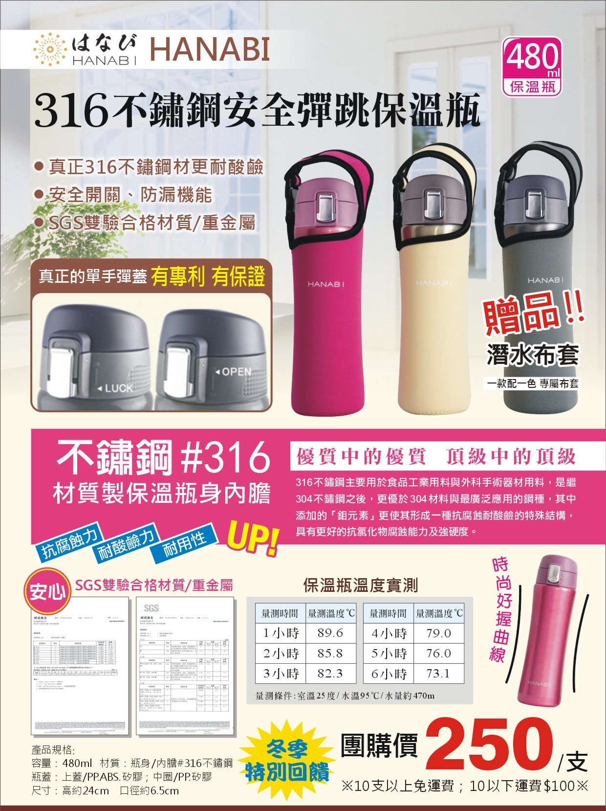 合作社代訂HANABI 316不鏽鋼安全彈跳保溫瓶(贈潛水布套/一款配一色),數量有限售完為止,如有要訂購之同仁請依附表格式填妥後至合作社登記一併繳款。