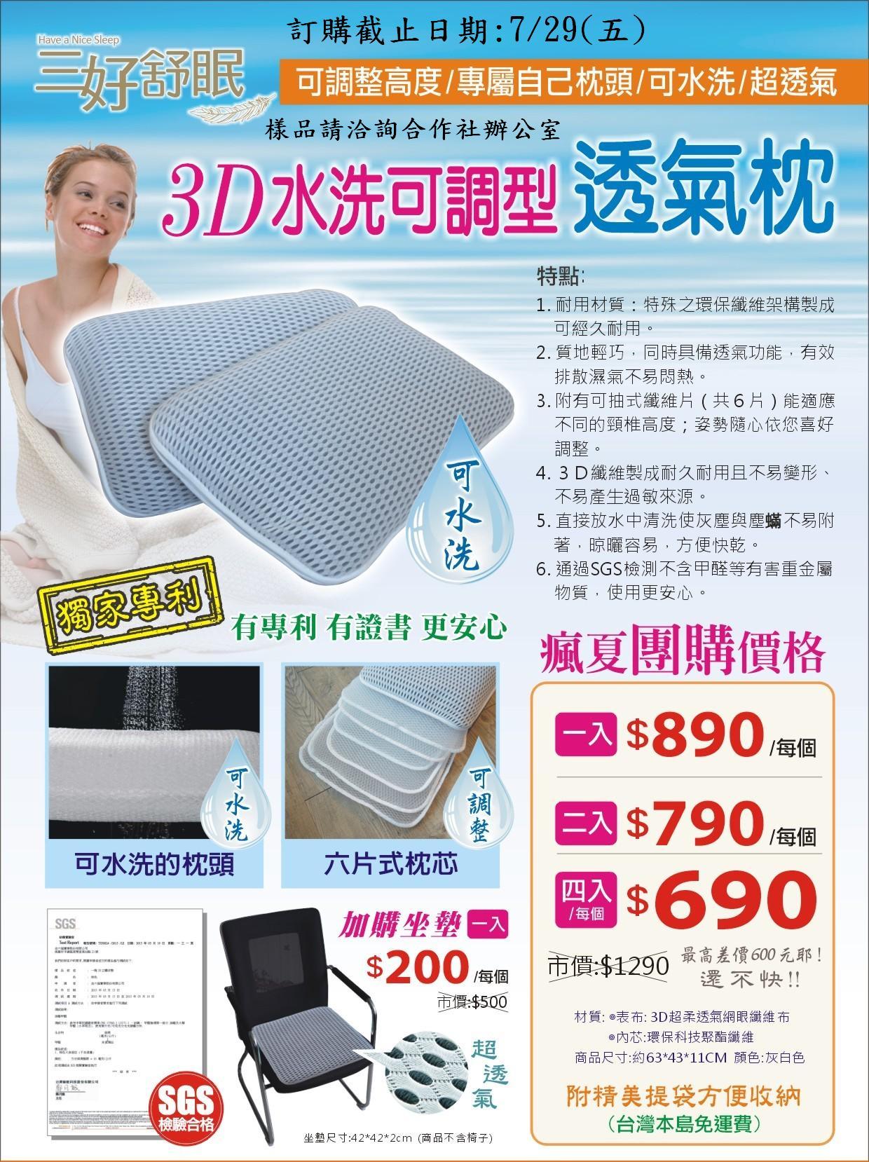 合作社代訂三好舒眠3D水洗可調型透氣枕(另可加購超透氣坐墊),如有要訂購之同仁請依附表格式填妥後至合作社登記一併繳款。訂購日期至7月29日下午4:30止。