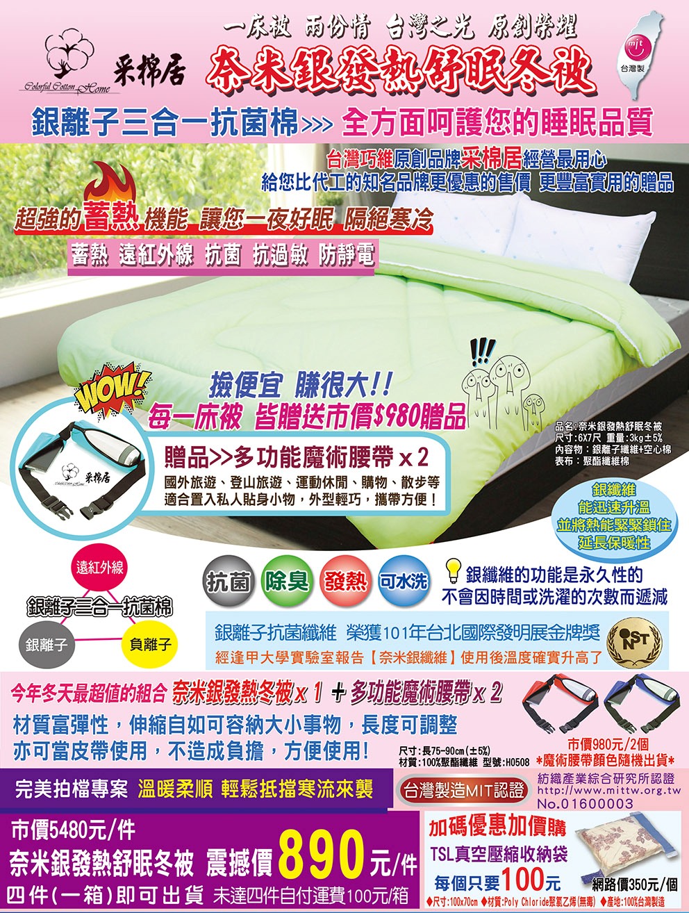 合作社代訂采棉奈米銀發熱舒眠冬被、獨立筒天絲釋壓抗菌枕,如有要訂購之同仁請依附表格式填妥後至合作社登記一併繳款。訂購日期至12月16日下午4:30止。