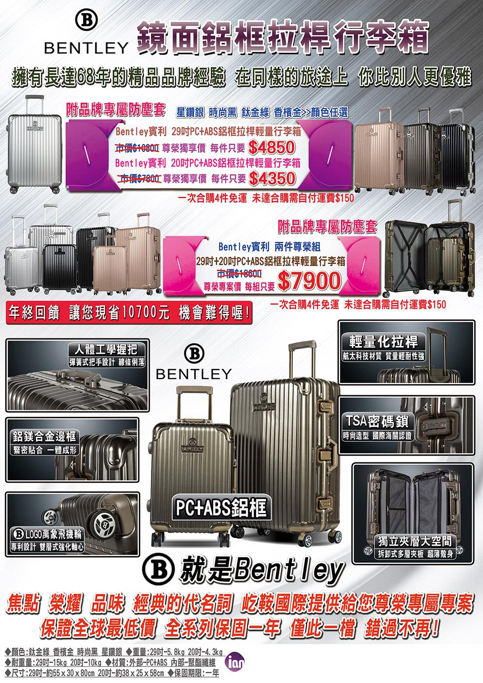 合作社代訂BENTLEY鏡面鋁框拉桿行李箱,如有要訂購之同仁請依附表格式填妥後至合作社登記一併繳款。訂購日期至1月15日下午4:30止。