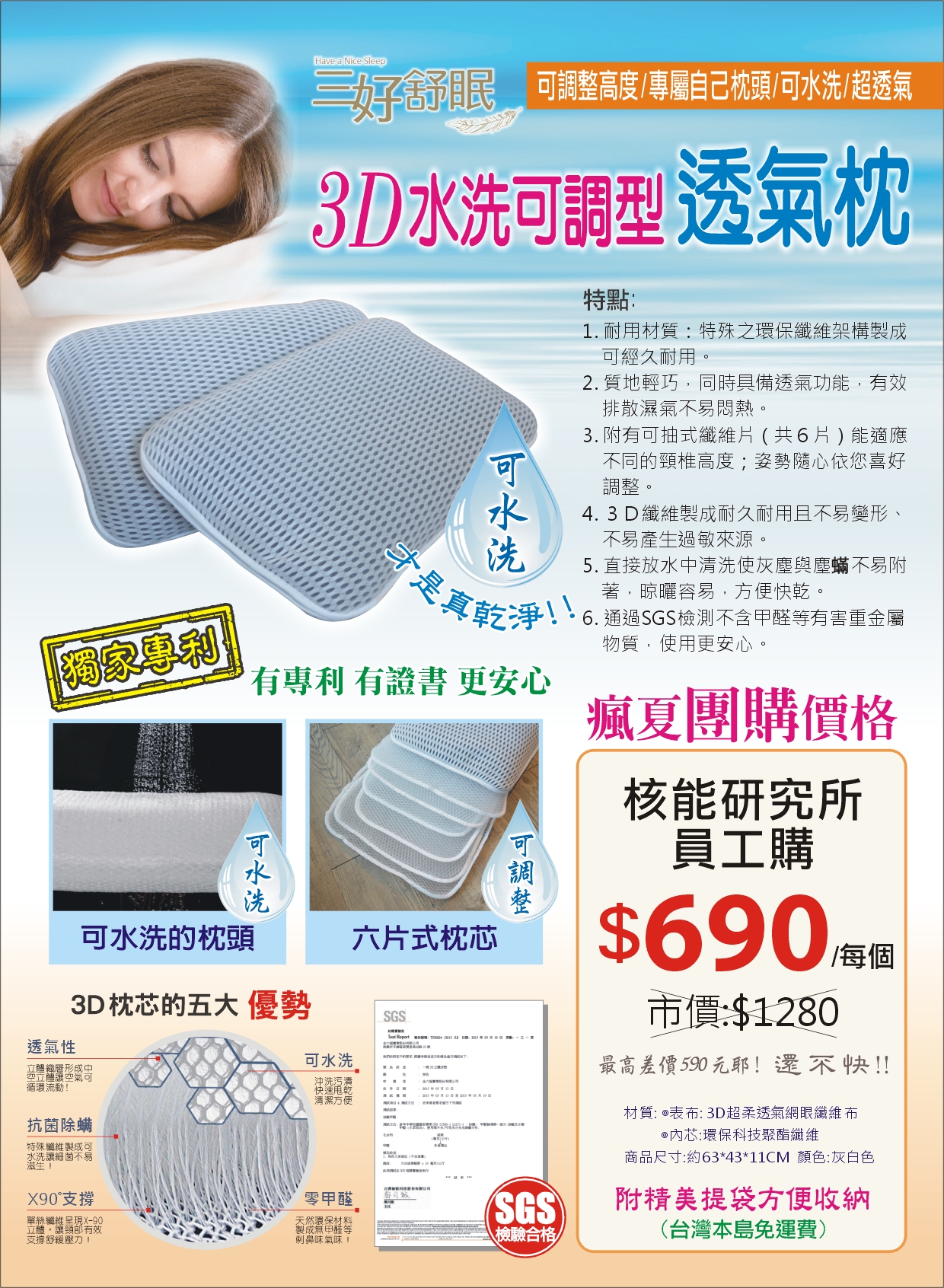 合作社代訂3D水洗可調型透氣枕,如有要訂購之同仁請依附表格式填妥後至合作社登記一併繳款。訂購日期至615下午4:30止。
