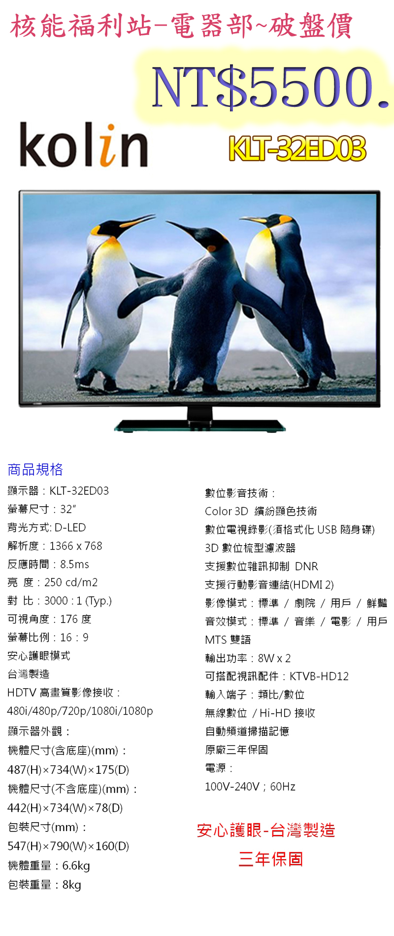 本社專櫃正一企業特賣Kolin KLT-32ED03液晶電視破盤價$5500,商品規格請參閱附件。