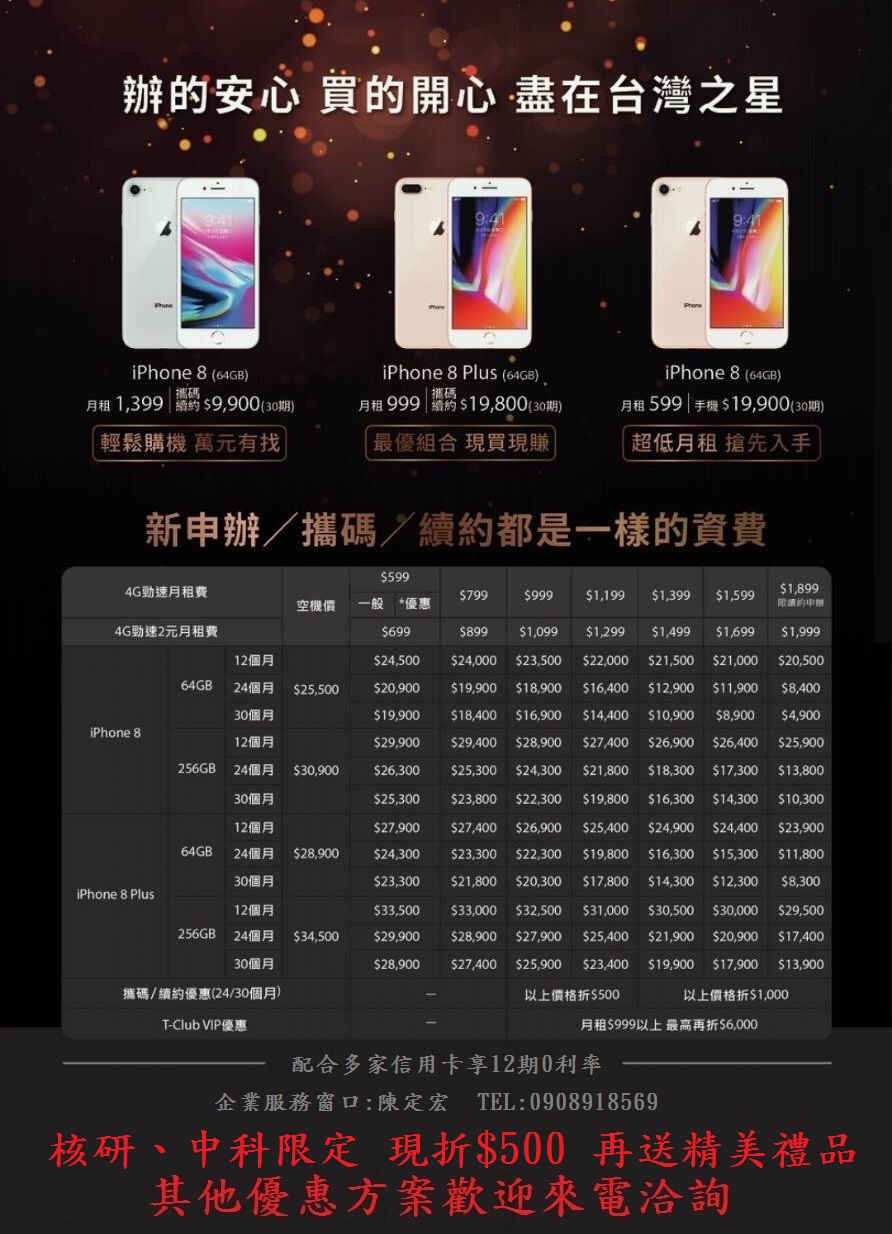 最新iphone8優惠專案,有需要的同仁歡迎來電洽談         專案服務人員:陳定宏0908-918569