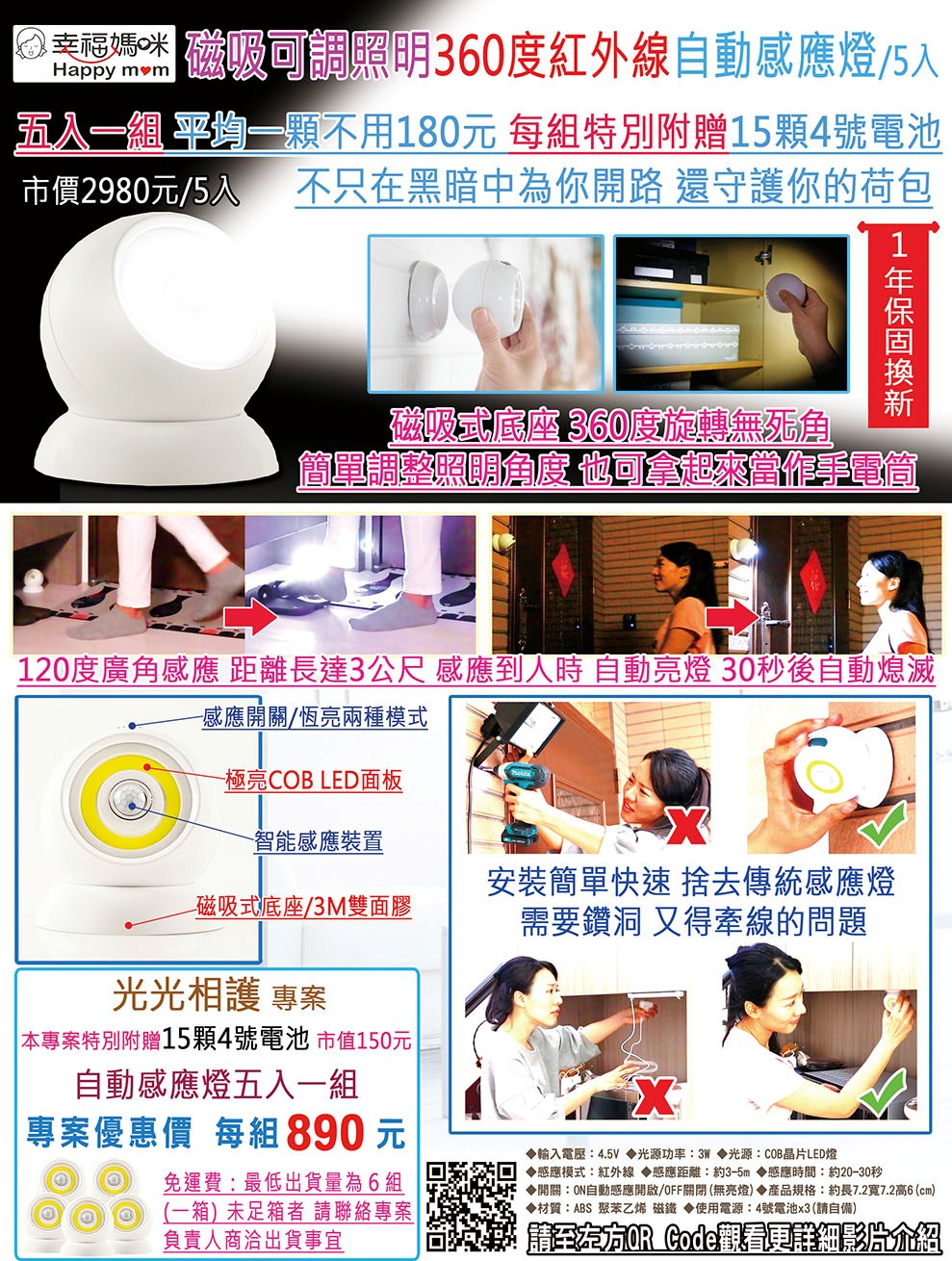 合作社代訂:磁吸可調照明360度紅外線自動感應燈,五入一組。