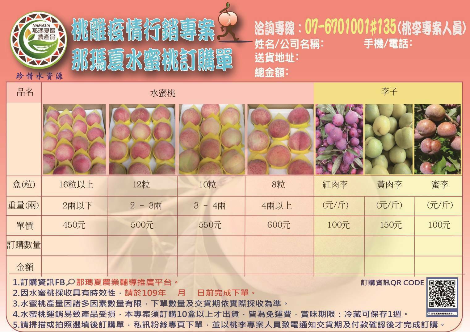 合作社轉登高雄市政府原住民事務委員會函以;因應新型冠狀病毒疫情衝擊,本市府原住民事務委員會為協助推廣原鄉產品那瑪夏區水蜜桃及李子,敬請4月20日前惠復訂購數量。檢附產品型錄一份,歡迎各位同仁支持選購。如有要訂購同仁,詳情請參酌附件訂購單。