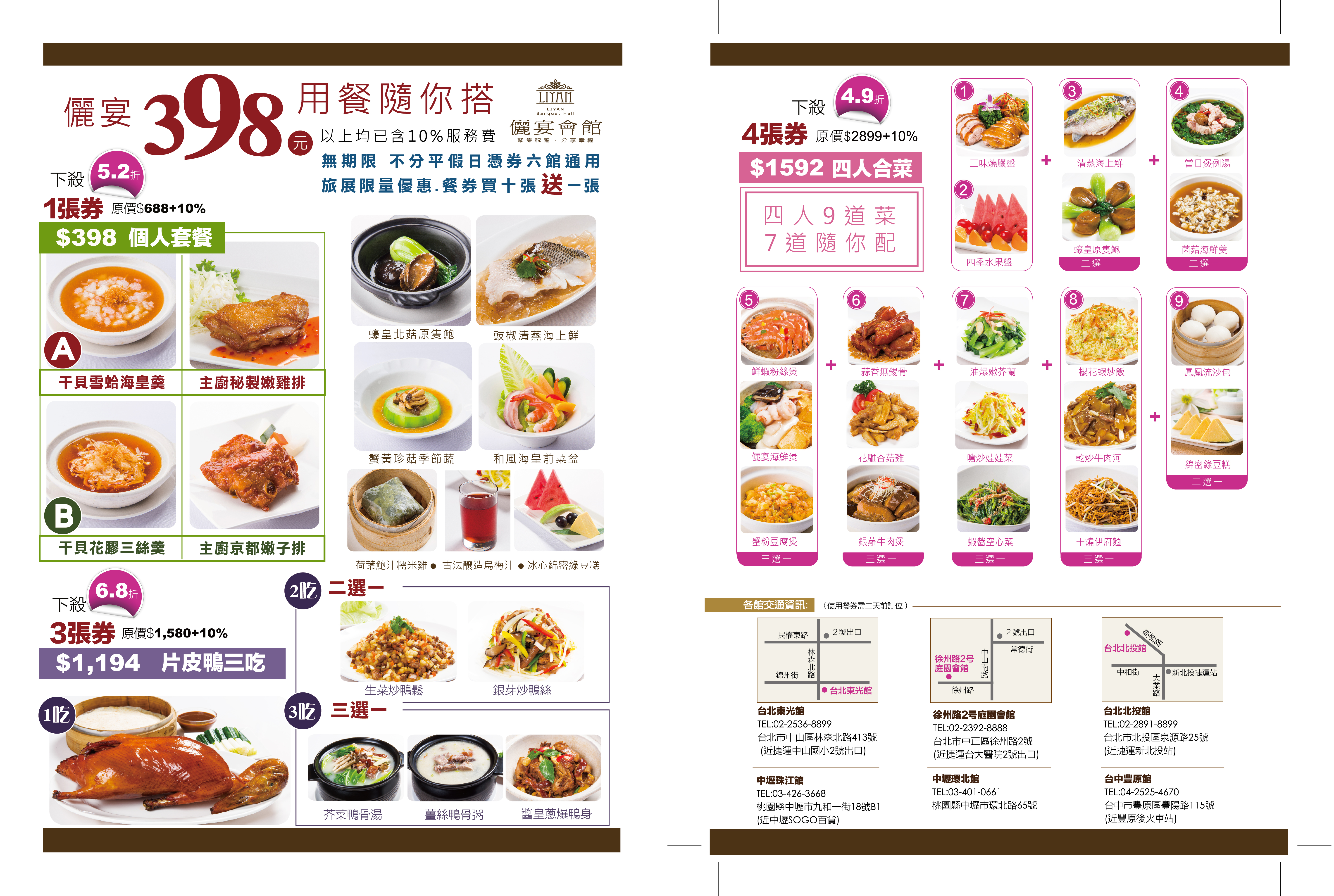 398超值餐券;一券多用,一張享套餐、三張片皮鴨三吃、