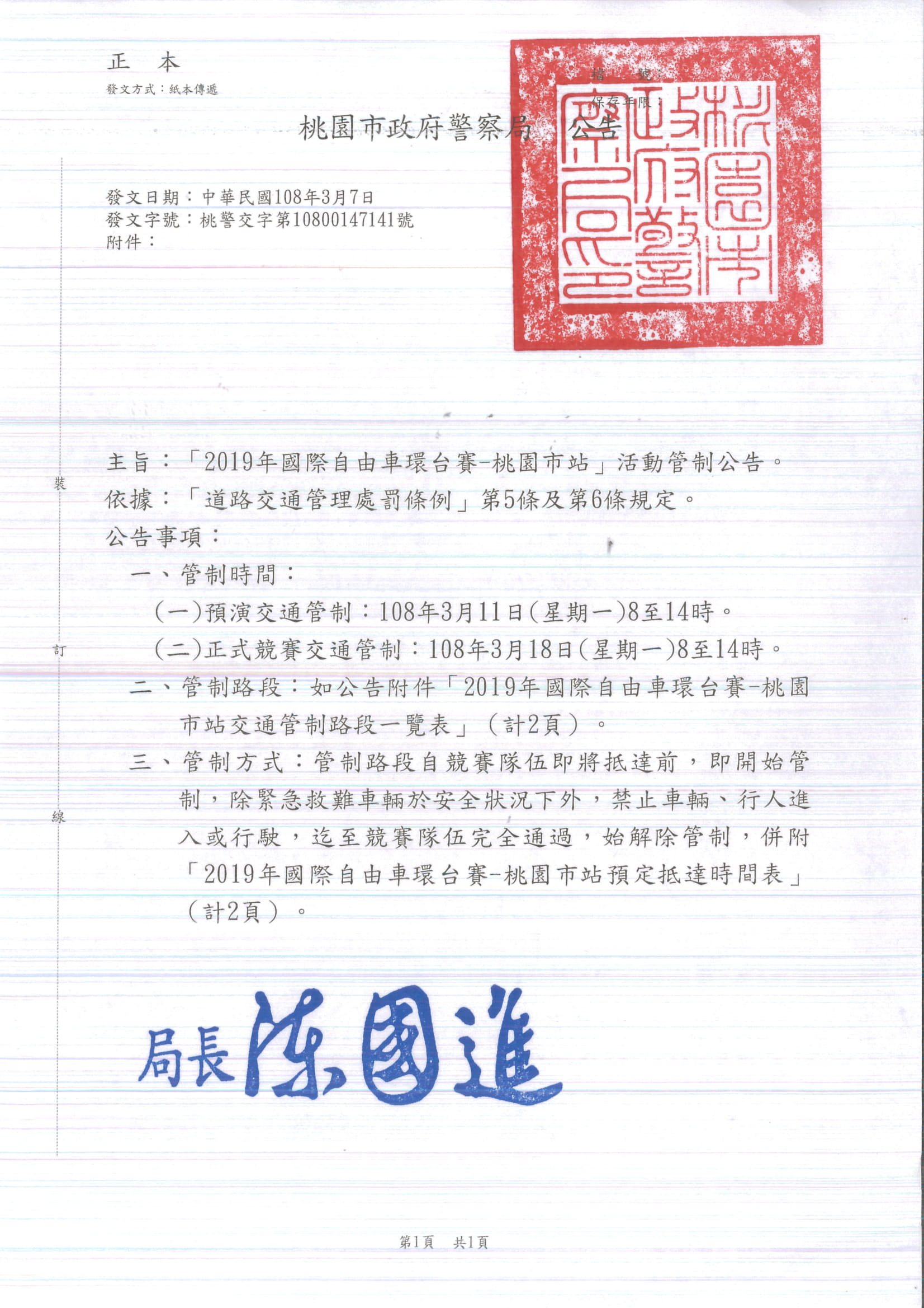 三、檢附桃園市政府警察局公告、交通管制路段一覽表、預定抵達時間表各1份。