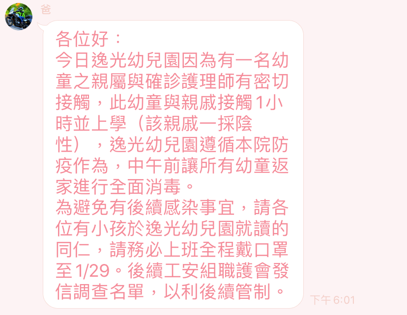內容:轉達逸光幼兒園通知,因逸光幼兒園有一名幼童之親屬與確診護理師有密切接觸,此幼童與親戚接觸1小時並上學(該親戚一採陰),逸光幼兒園遵循該院防疫作為,讓所有幼童返家進行全面消毒。為避免有後續感染事宜,請各位有小孩於逸光幼兒園就讀的同仁,請務必上班全程配戴口罩至129日。