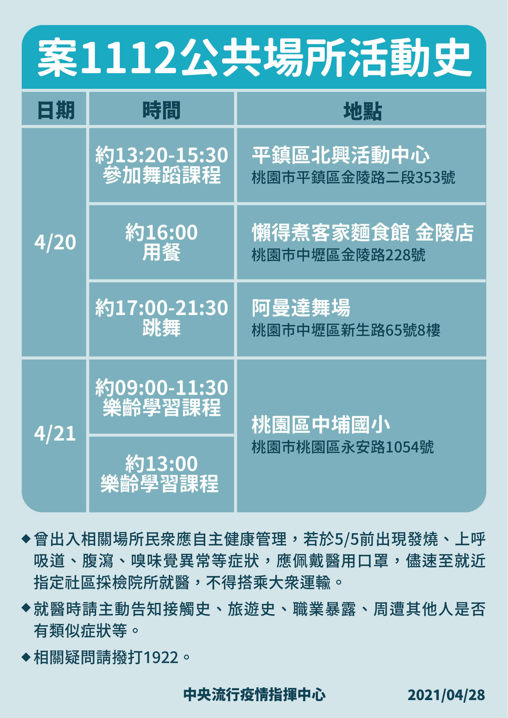 因應中央流行疫情指揮中心公布案1112公共活動史如附件,所屬同仁或同住之眷屬若有重複之活動軌跡,請於今日(110年4月28日)下午415分前回復人事室。