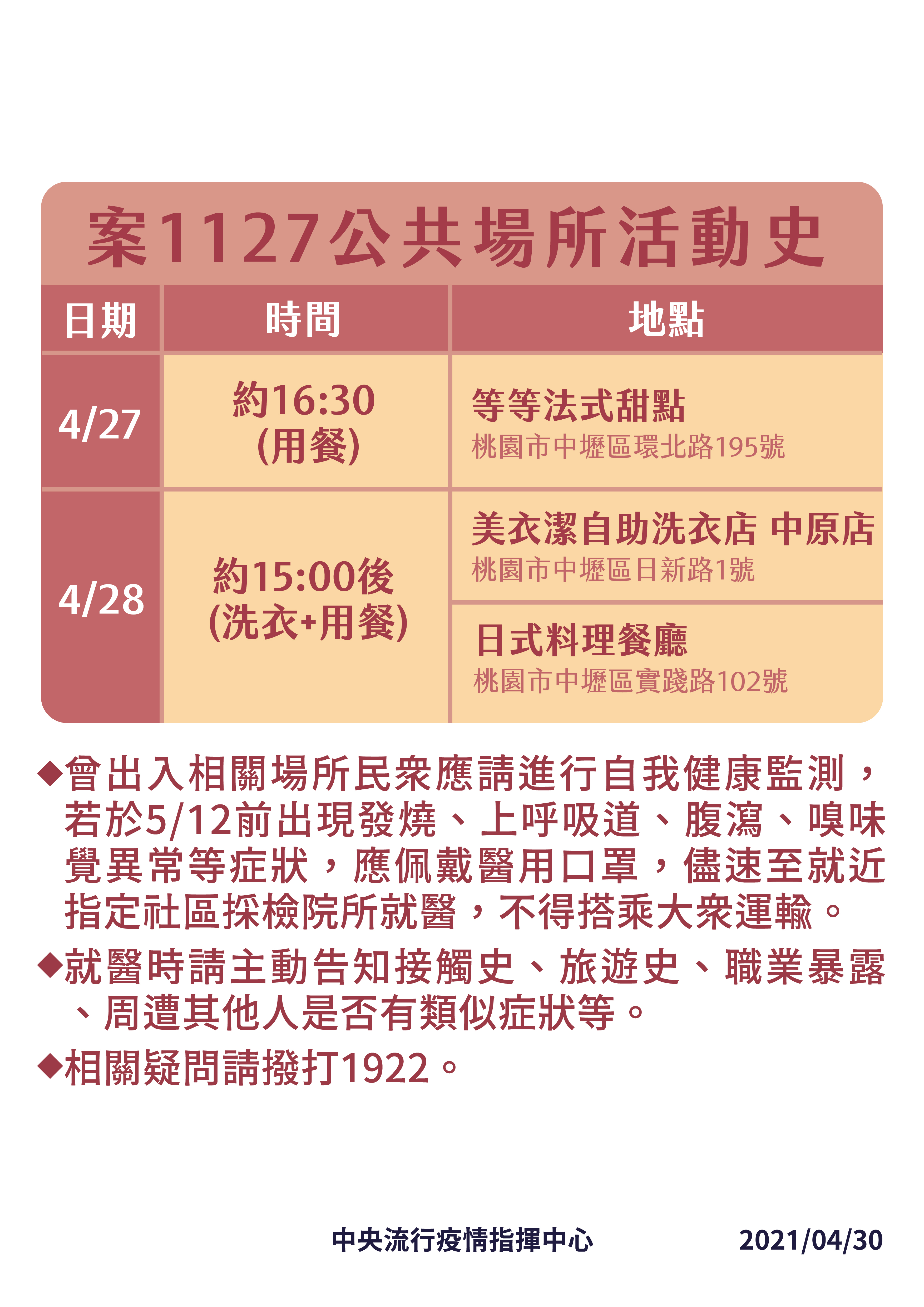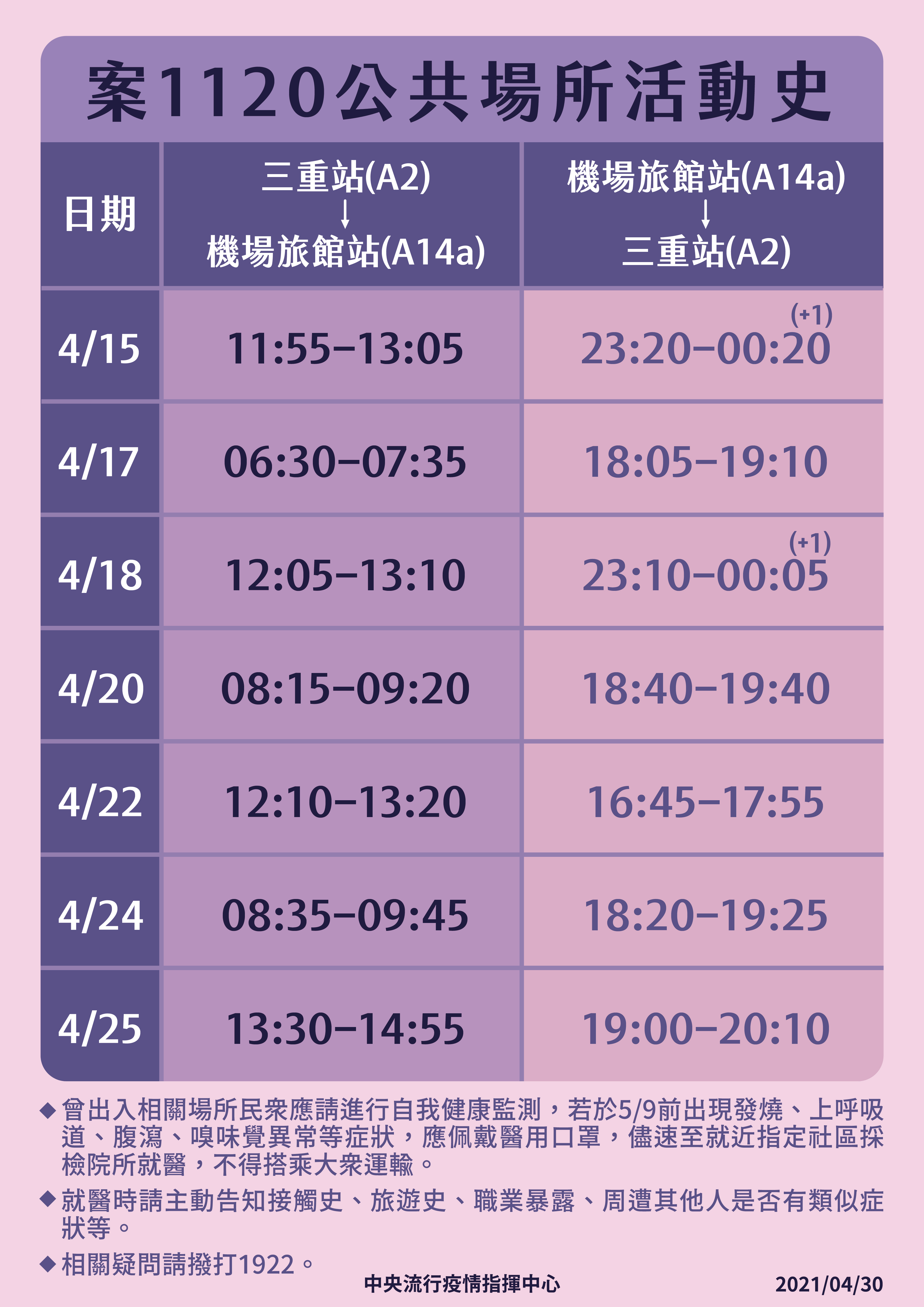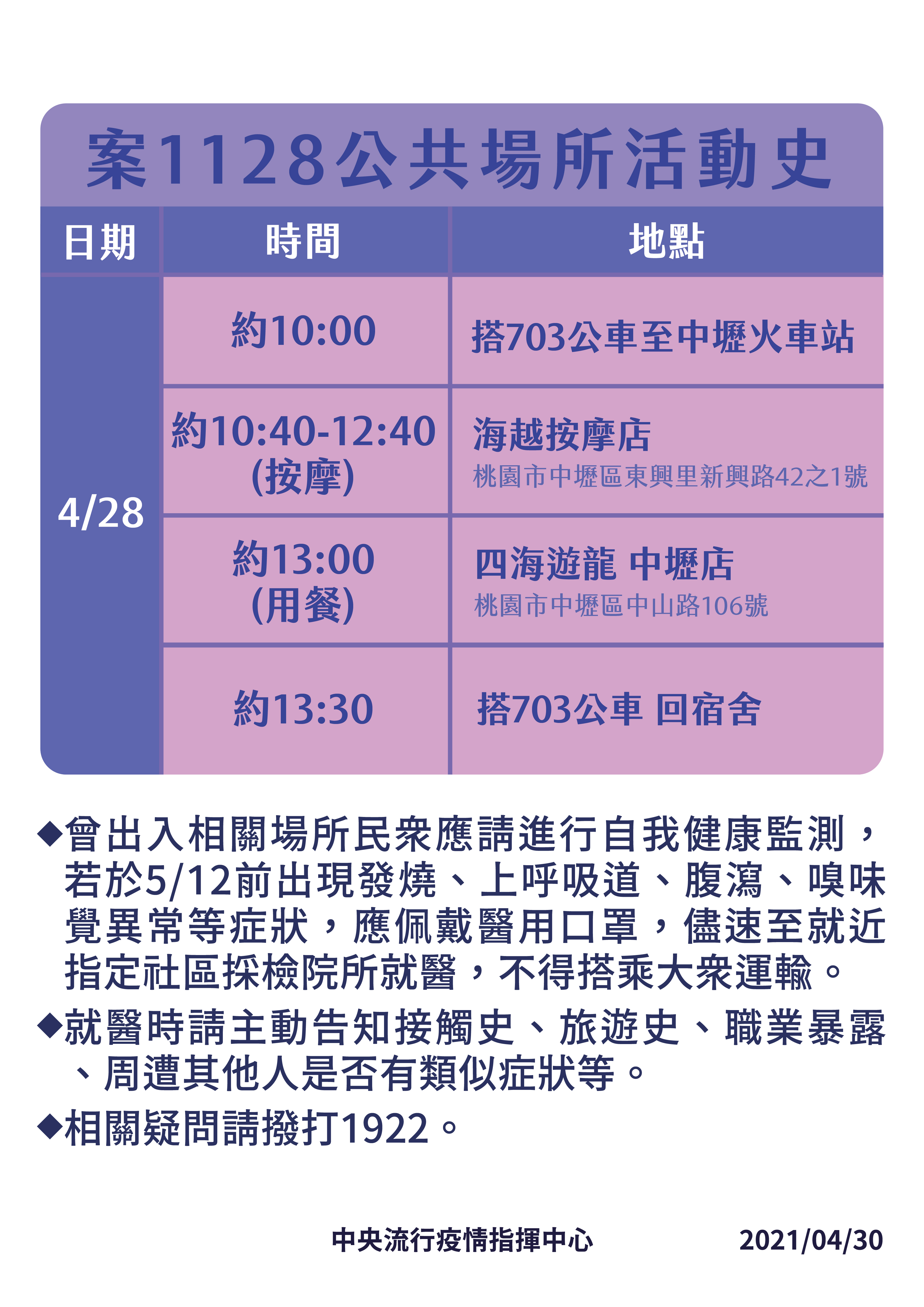 中央流行疫情指揮中心今日(4/30)公布之案1120、案1127及案1128公共場所活動史如附件,請各單位調查所屬同仁是否有相同足跡,於今日下午415分前回復人事室。