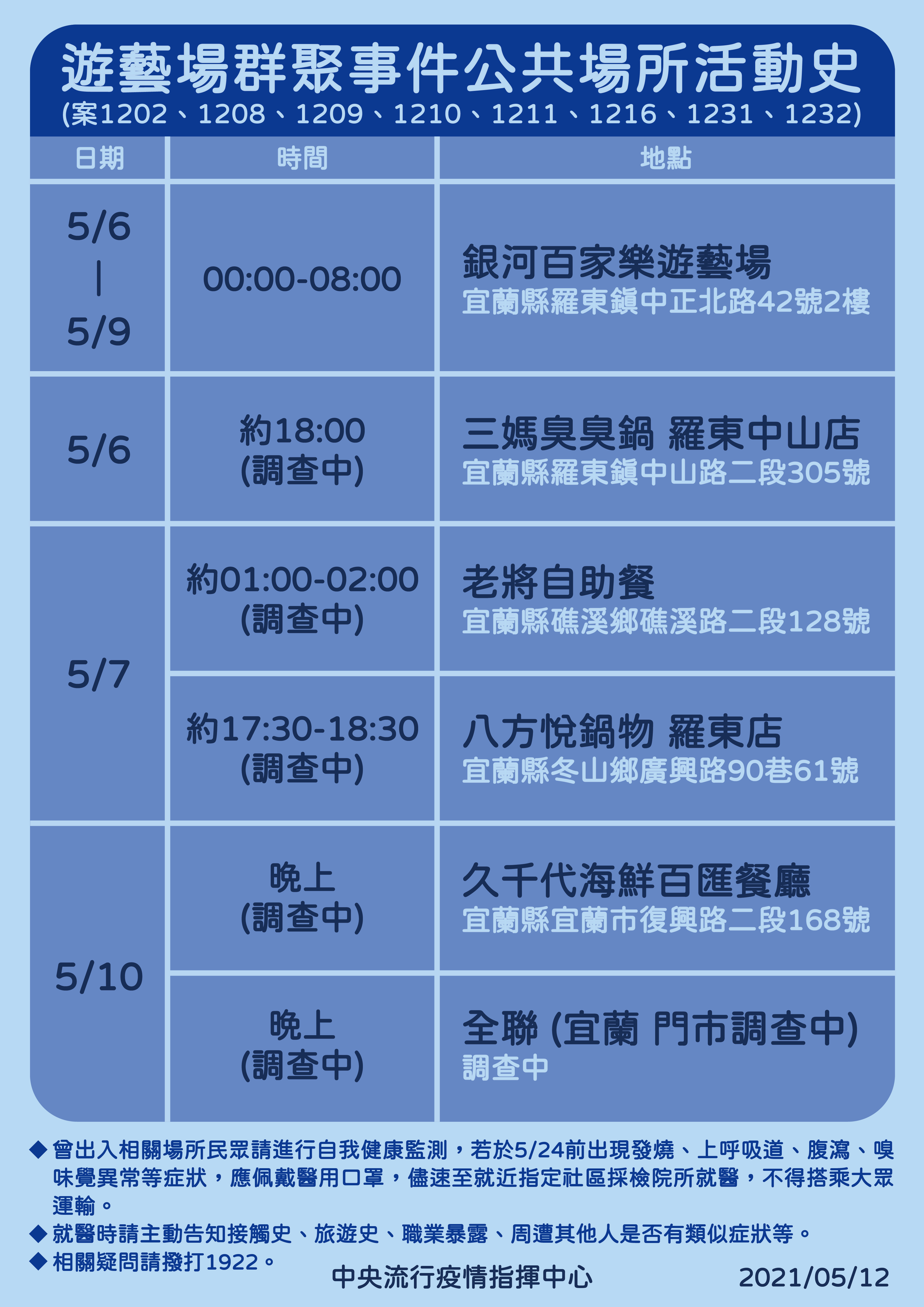 中央流行疫情指揮中心今日(5/11)公布之宜蘭遊藝場本土個案(案1202、1208、1209、1210、1211、1216、1231、1232)之活動史如附件,請進行同仁足跡調查。
