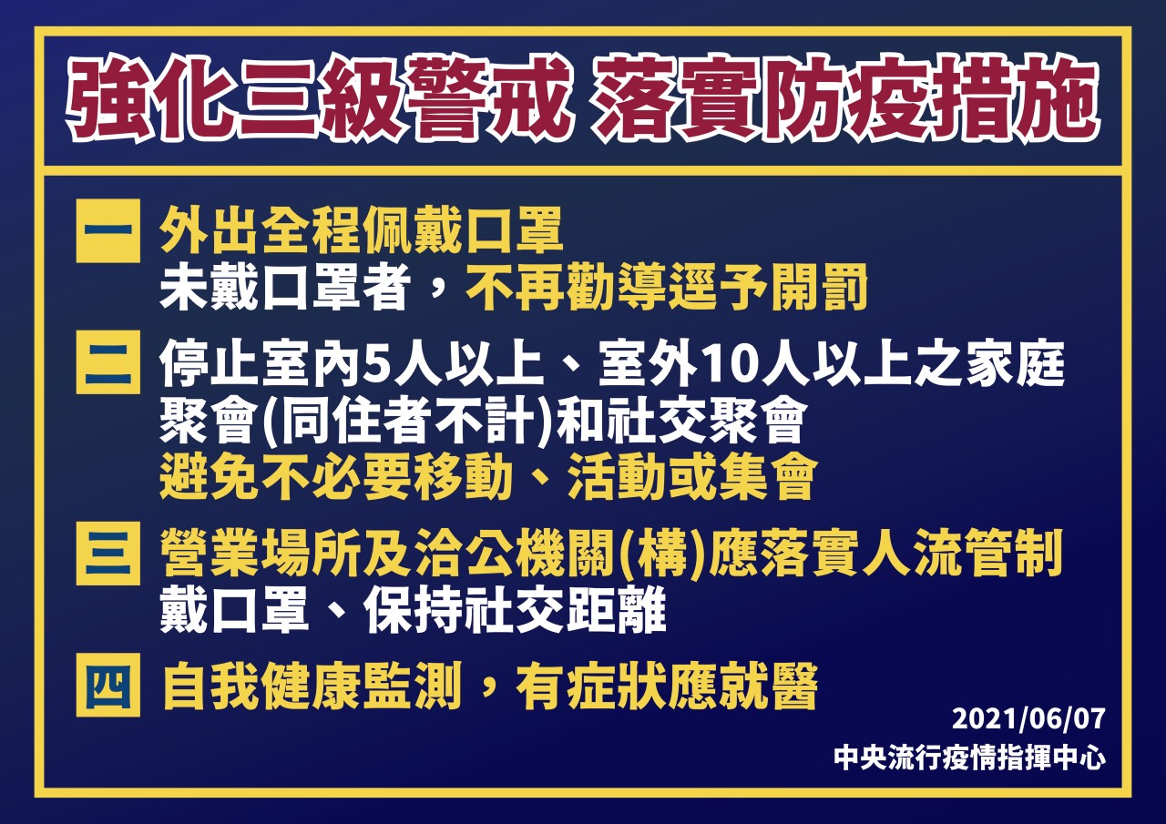 全國疫情警戒持續維持第三級,指揮中心也公布12項防疫措,請確實遵照辦理,並減少端午節連假人流移動。