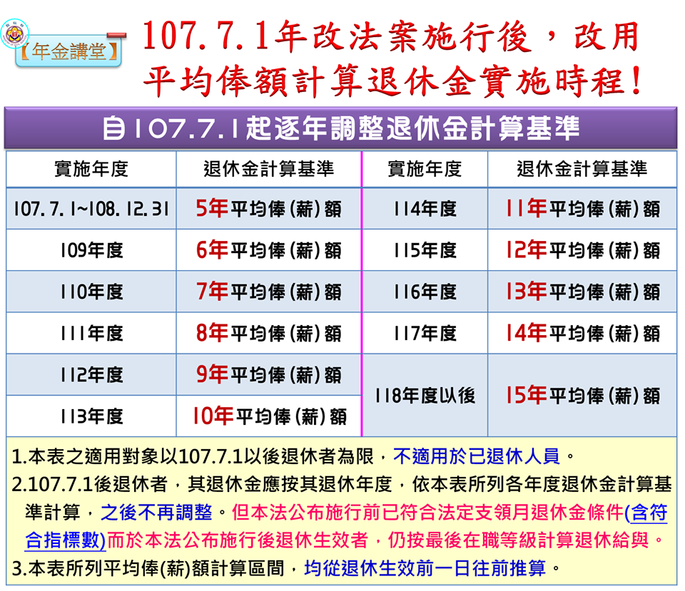 107年7月1日年改法案施行後,改用平均俸額計算退休金實施時程