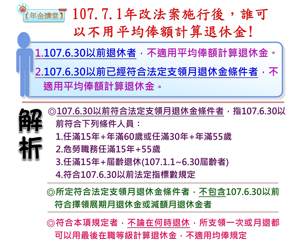 1.107.6.30以前退休者,不適用平均俸額計算退休金。