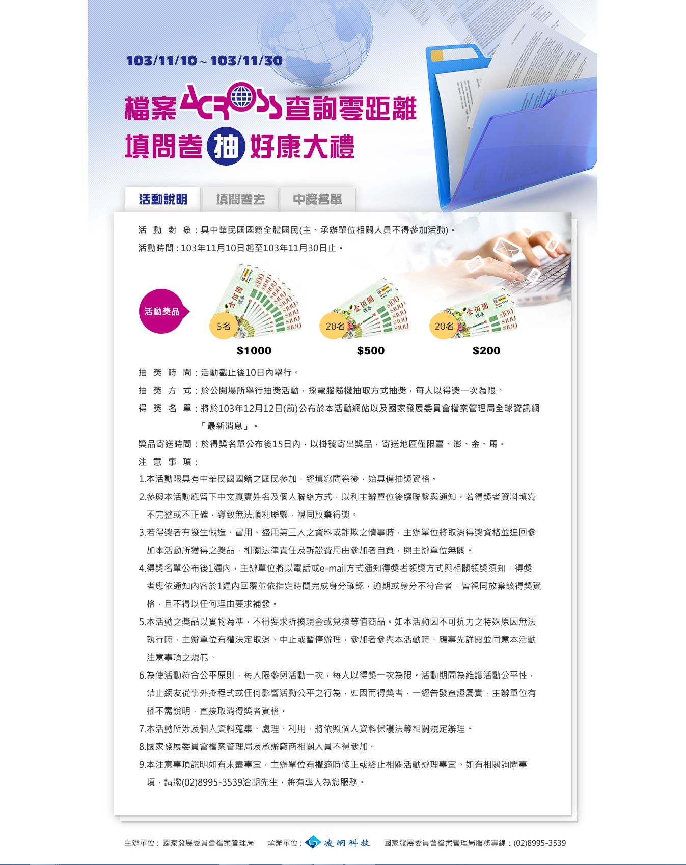 檔案局舉辦「檔案ACROSS查詢零距離--填問卷抽好康大禮」活動,請參閱附件。