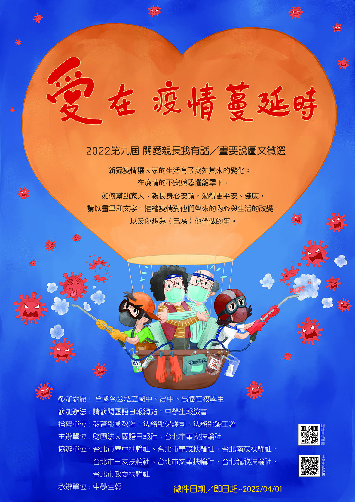 財團法人國語日報社辦理2022第九屆「關愛親長我有話/畫要說:愛在疫情蔓延時」圖文徵選活動,本活動徵件時間自即日起至111年4月1日截止收件,請鼓勵子女或適齡之青少年(國中及高中生)踴躍報名參加。