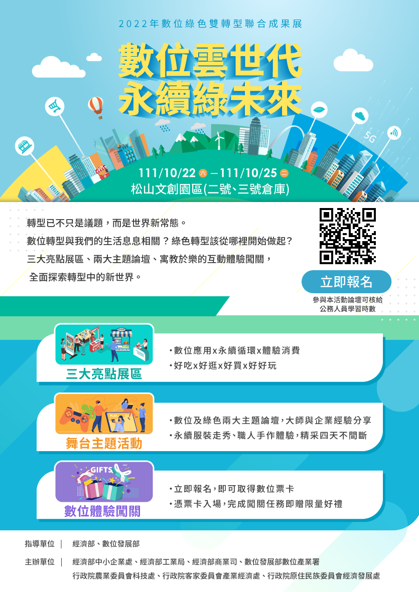經濟部與數位發展部訂於本(111)1022(星期六)1025(星期二)於松山文創園區舉辦「2022年數位綠色雙轉型聯合成果展」,有興趣的同仁可利用1022()23()周末假日期間自行前往觀展,如附件資訊。