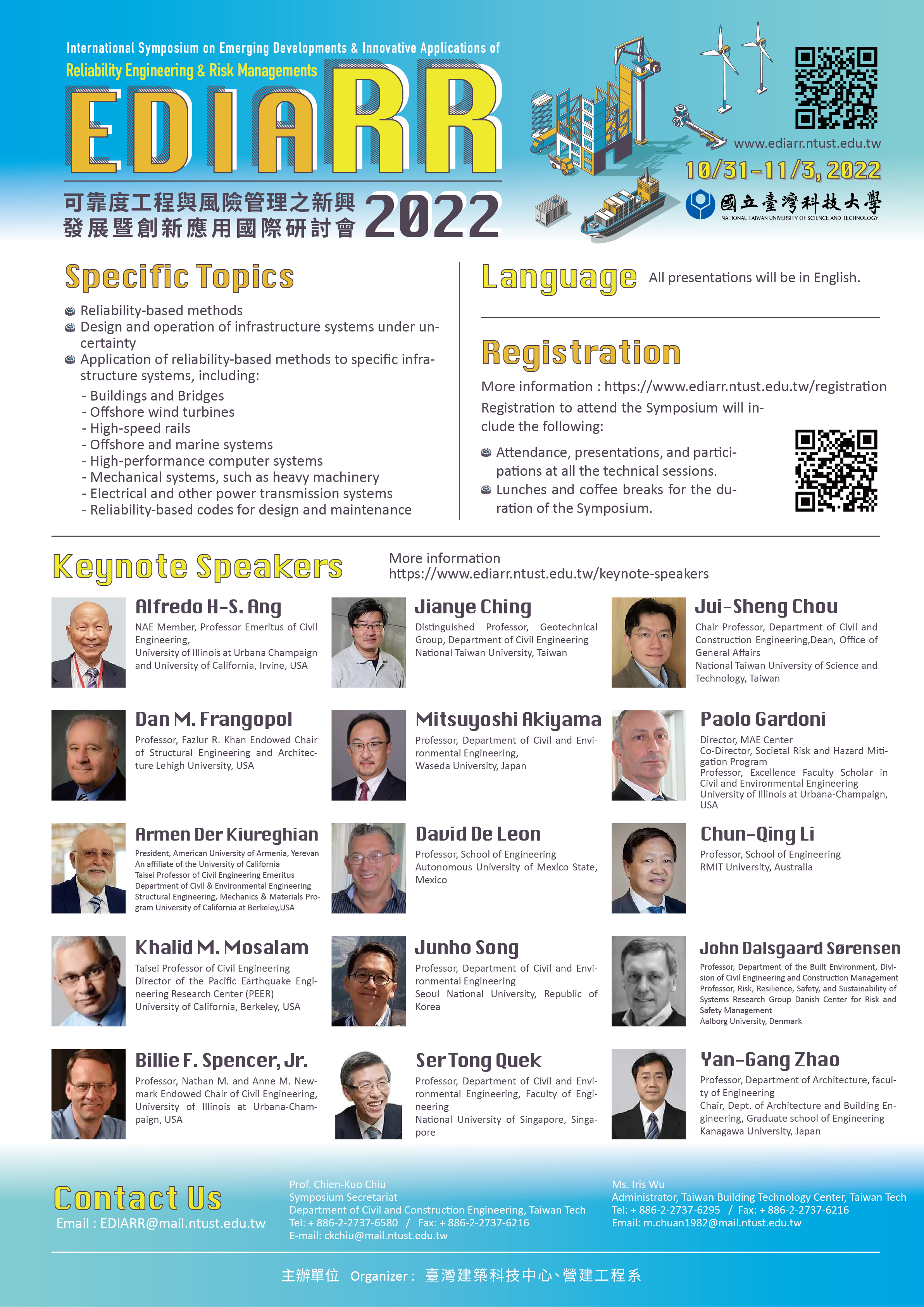 「可靠度工程與風險管理之新興發展暨創新應用國際研討會(EDIARR2022)」訂於今(111)年10月31日至11月2日於國立臺灣科技大學舉行。