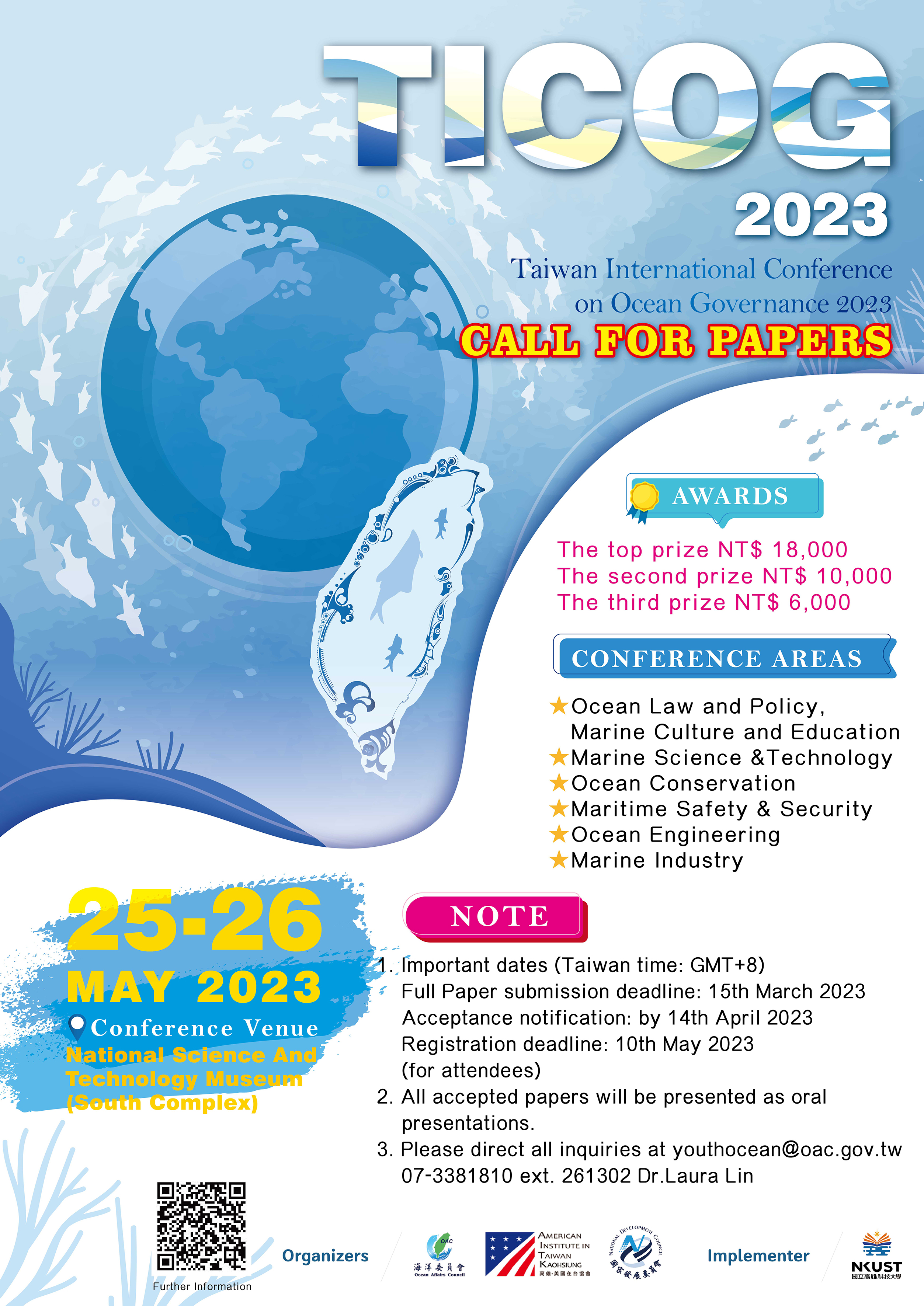 轉知海洋委員會、國家發展委員會與美國在台協會高雄分處(AIT/K)合作辦理「2023臺灣海洋治理國際研討會」中英文徵稿須知、報名表及宣傳海報各1份,請鼓勵所屬人員踴躍投稿報名參加一案如附,請參考。