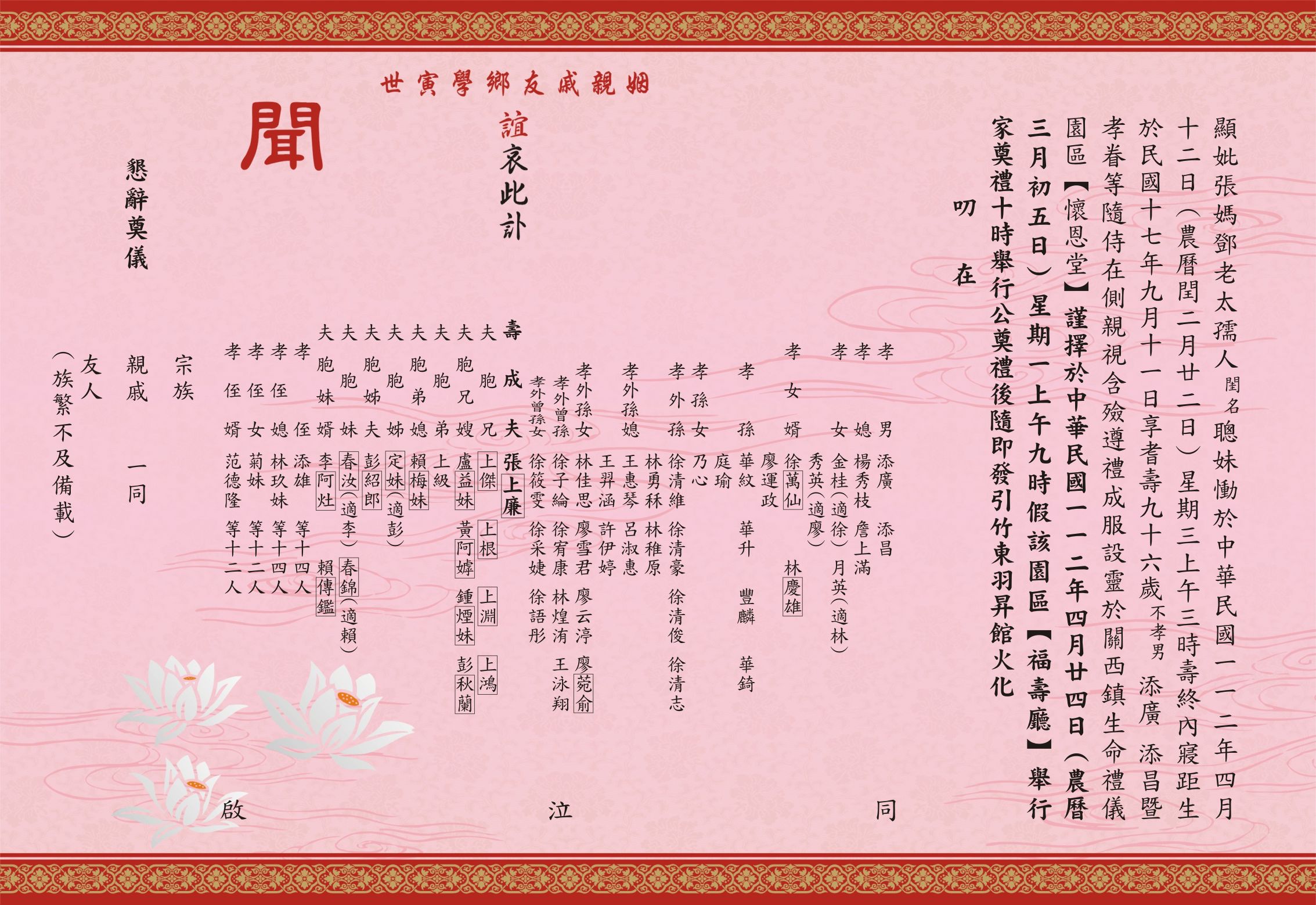 二、地點:新竹縣關西鎮北山里八鄰店子岡十二之十號(關西鎮生命禮儀園區【福壽廳】)