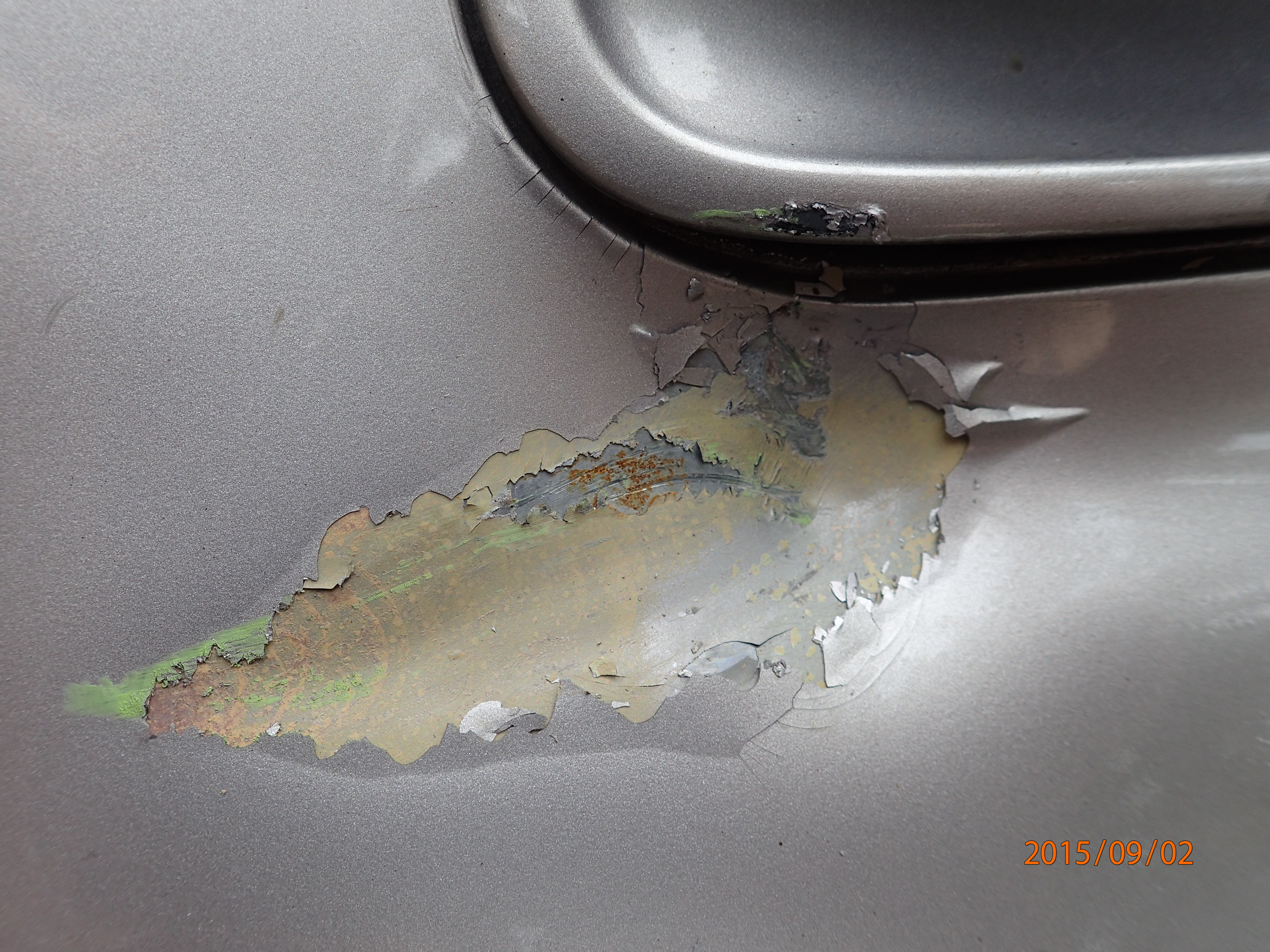 遭撞車況:左前門被撞凹一個大窟窿,撞擊點有留下對方車輛淺綠色之漆(如附圖2、3),
