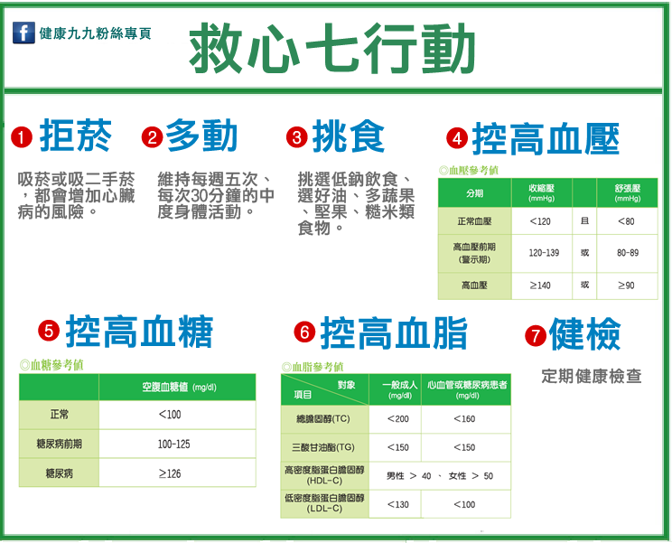 發佈者: 陳雪華9月29日是世界心臟日,世界心臟聯盟提出的主題是「健康『心』環境」。在我國,心臟病是國人第二號殺手。國健署提出救心7行動-「拒菸」、「挑食」、「多動」、「控三高」(高血壓、高血糖、高血脂)及「健檢」,幫助國人擁有ㄧ顆可長長久久,活力充沛的好心臟。