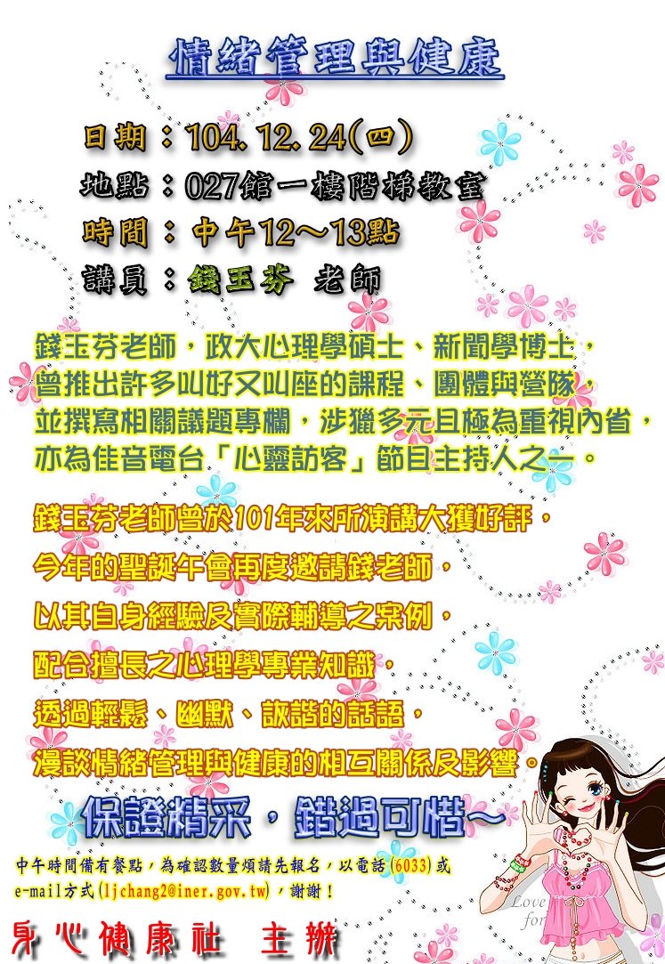 身心健康社訂於12/24(四)中午12點~13點,於027館1樓階梯教室,