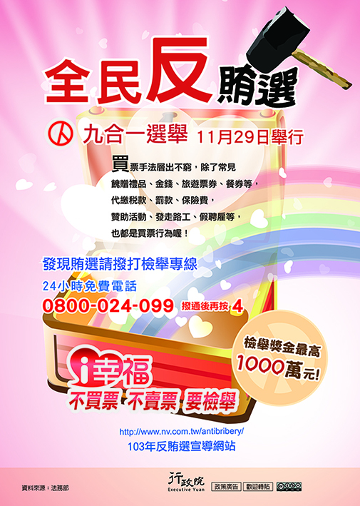 11月29日九合一選舉日,全民反賄選:不買票、不賣票、要檢舉!檢舉獎金最高1000萬元!