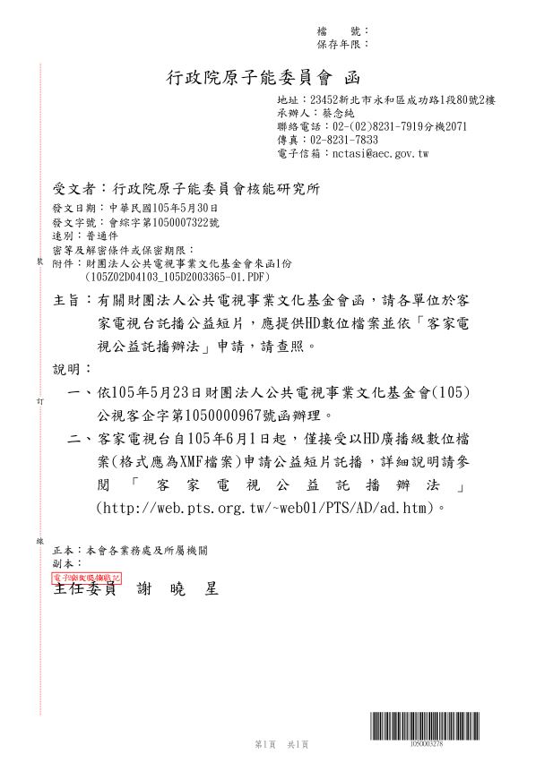 轉知財團法人公共電視事業文化基金會函,請各單位於客家電視台託播公益短片,應提供HD數位檔案並依「客家電視公益託播辦法」申請。