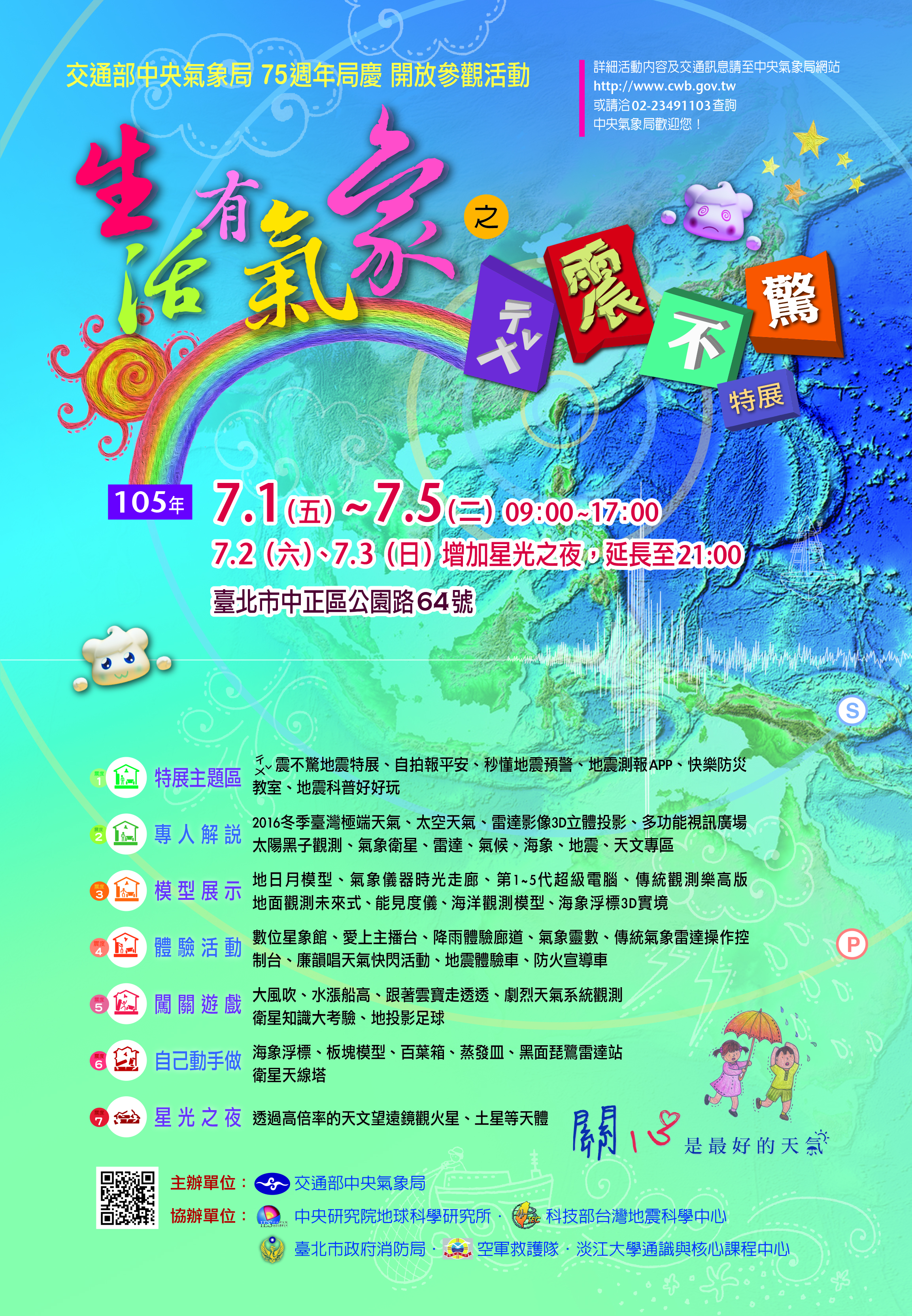 轉知中央氣象局「75週年局慶開放參觀『生活有氣象之處震不驚特展』」活動海報及導覽摺頁電子檔