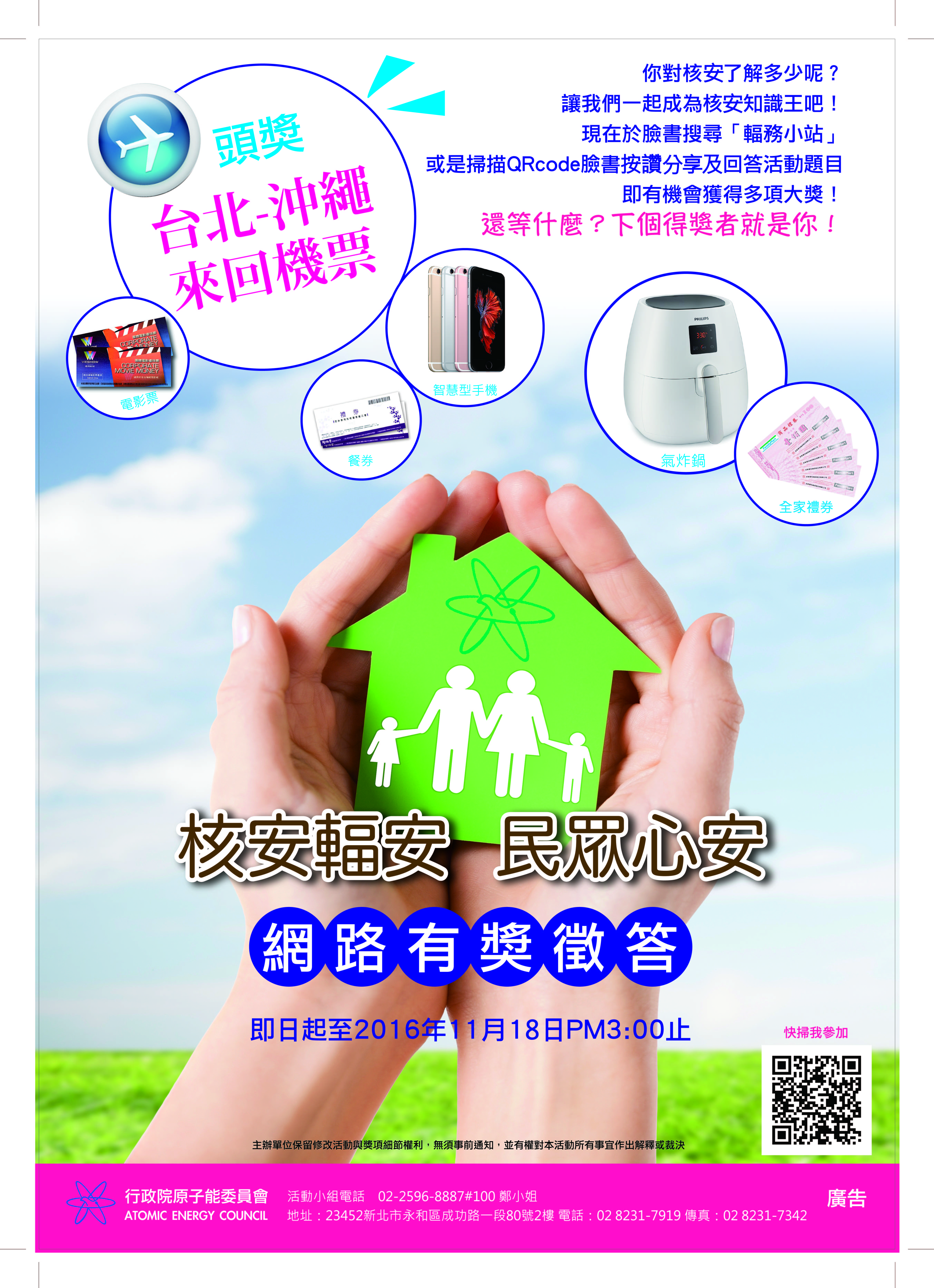 轉知原能會臉書「輻務小站」辦理「105年守護核安網路有獎徵答」活動,歡迎同仁踴躍參加。