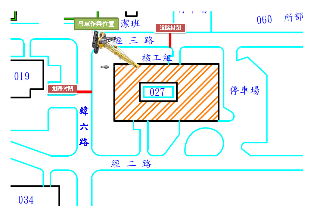 為配合『027館中庭化糞池更新工程』,預計於1061213-14日有大型吊車進行吊運作業,為確保人員及機具操作安全,將封閉027館旁經三路及緯六路部份道路(請參考附圖標示),造成不便敬請見諒!!