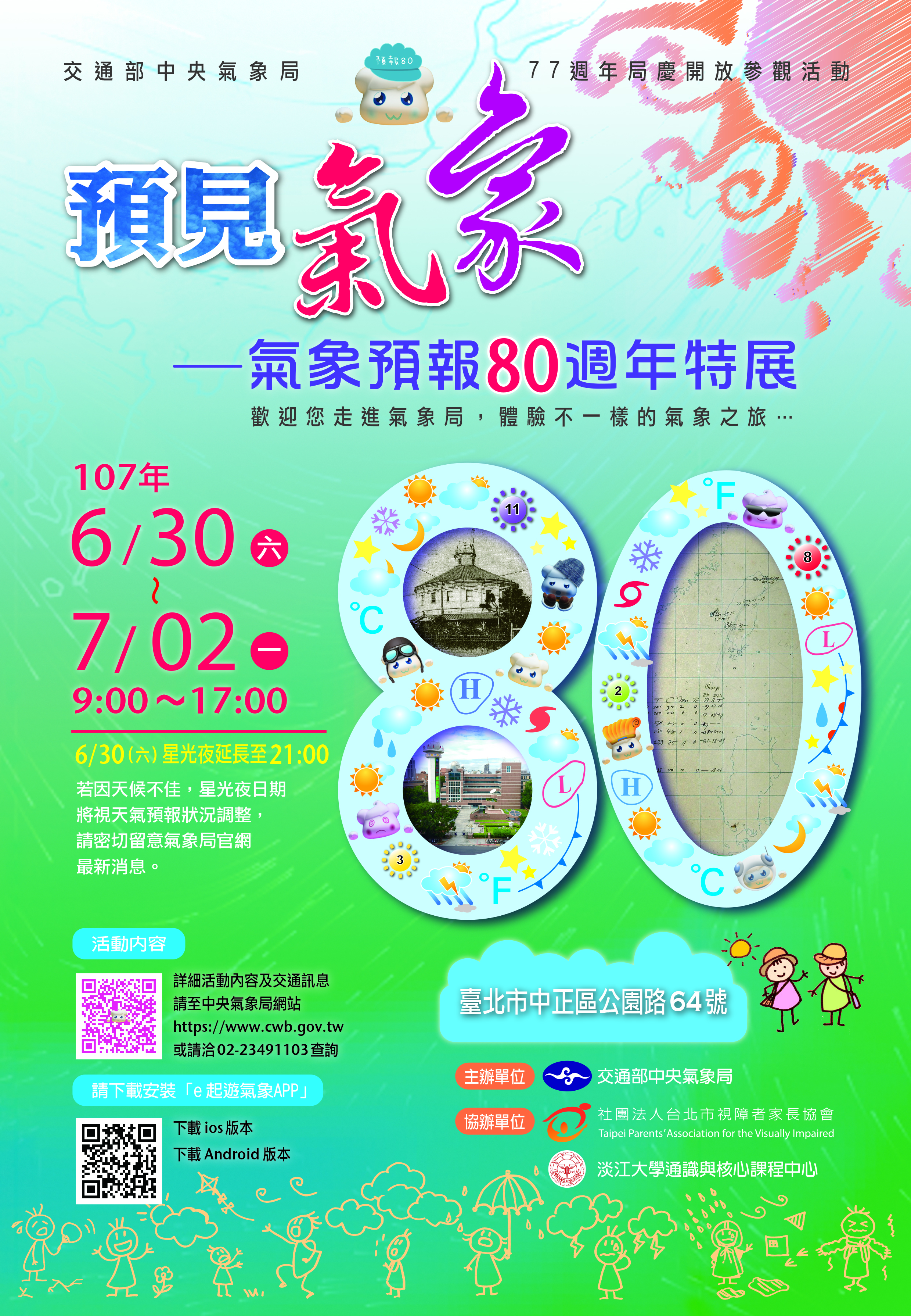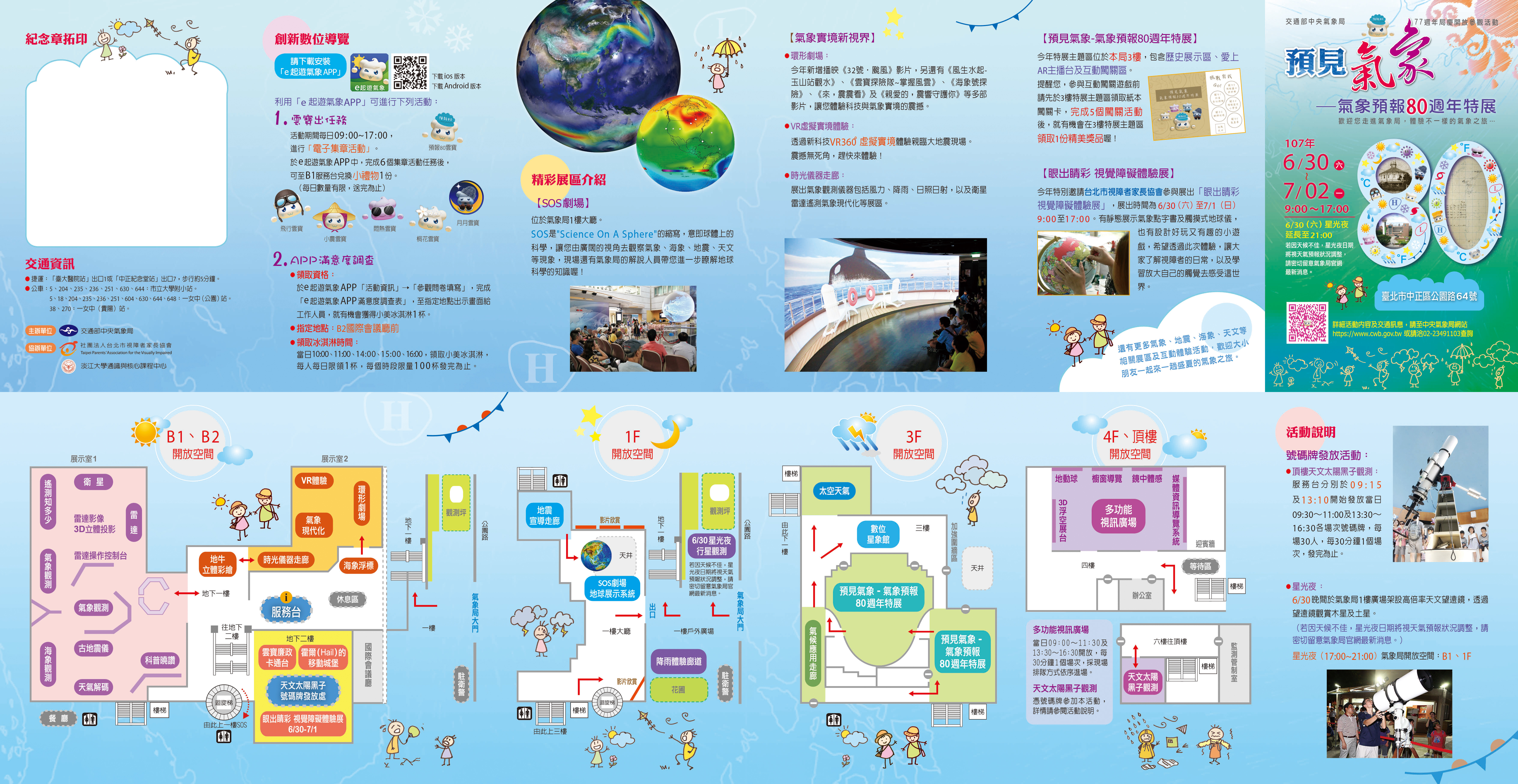 交通部中央氣象局訂於本(107)年6月30日至7月2日(星期六至星期一)舉辦77週年局慶開放參觀「預見氣象-氣象預報80週年特展」,歡迎同仁利用假日前往參觀。