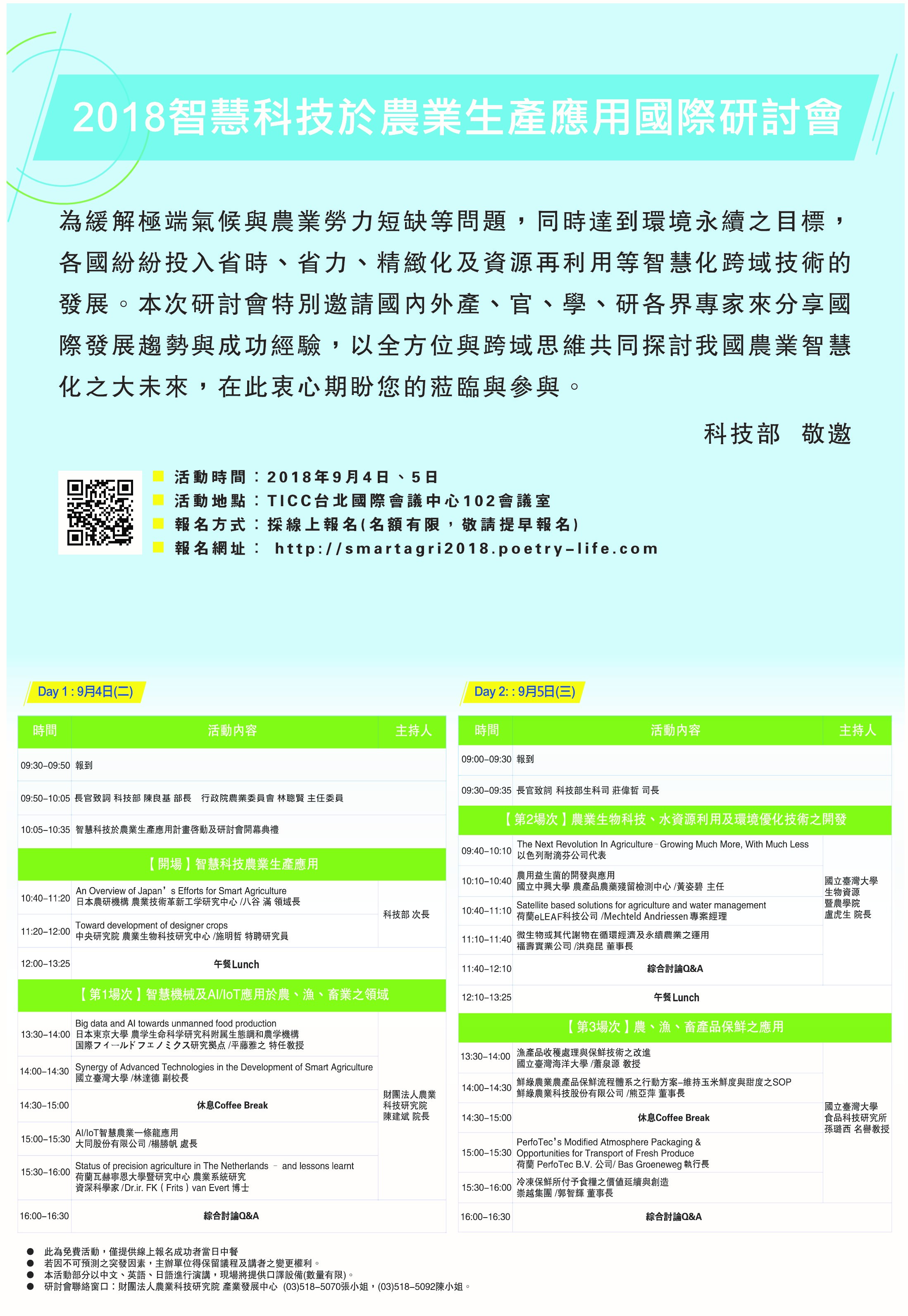 三、報名方式:採網路線上報名,名額有限,請提早報名。 網址為http://smartagri2018.poetry-life.com。