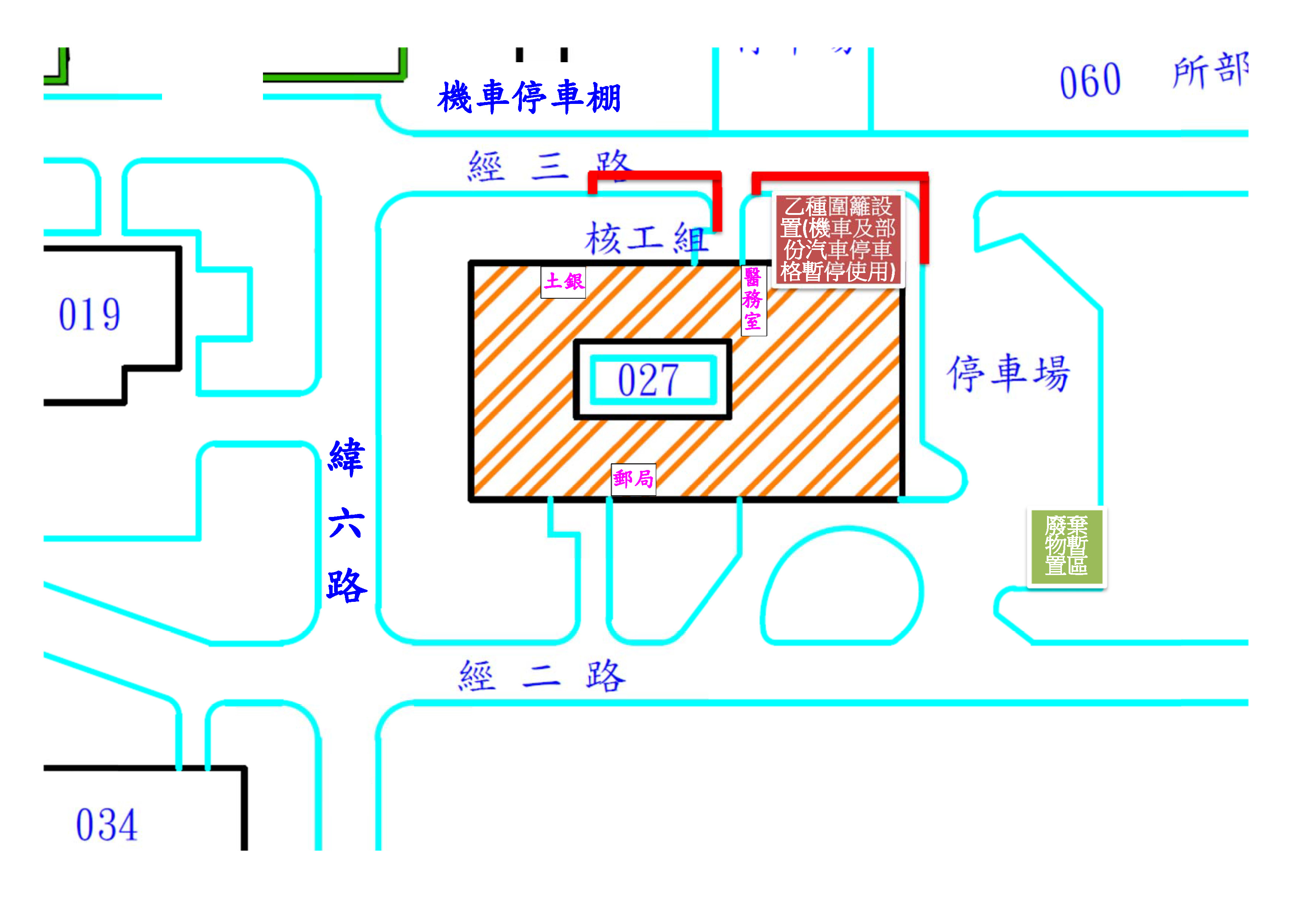 二、027館醫務室旁出入口設置有乙種圍籬之行人通行空間(請詳附圖),請至該館郵局、土銀及醫務室或進出洽公同仁注意安全,造成不便,敬請見諒。