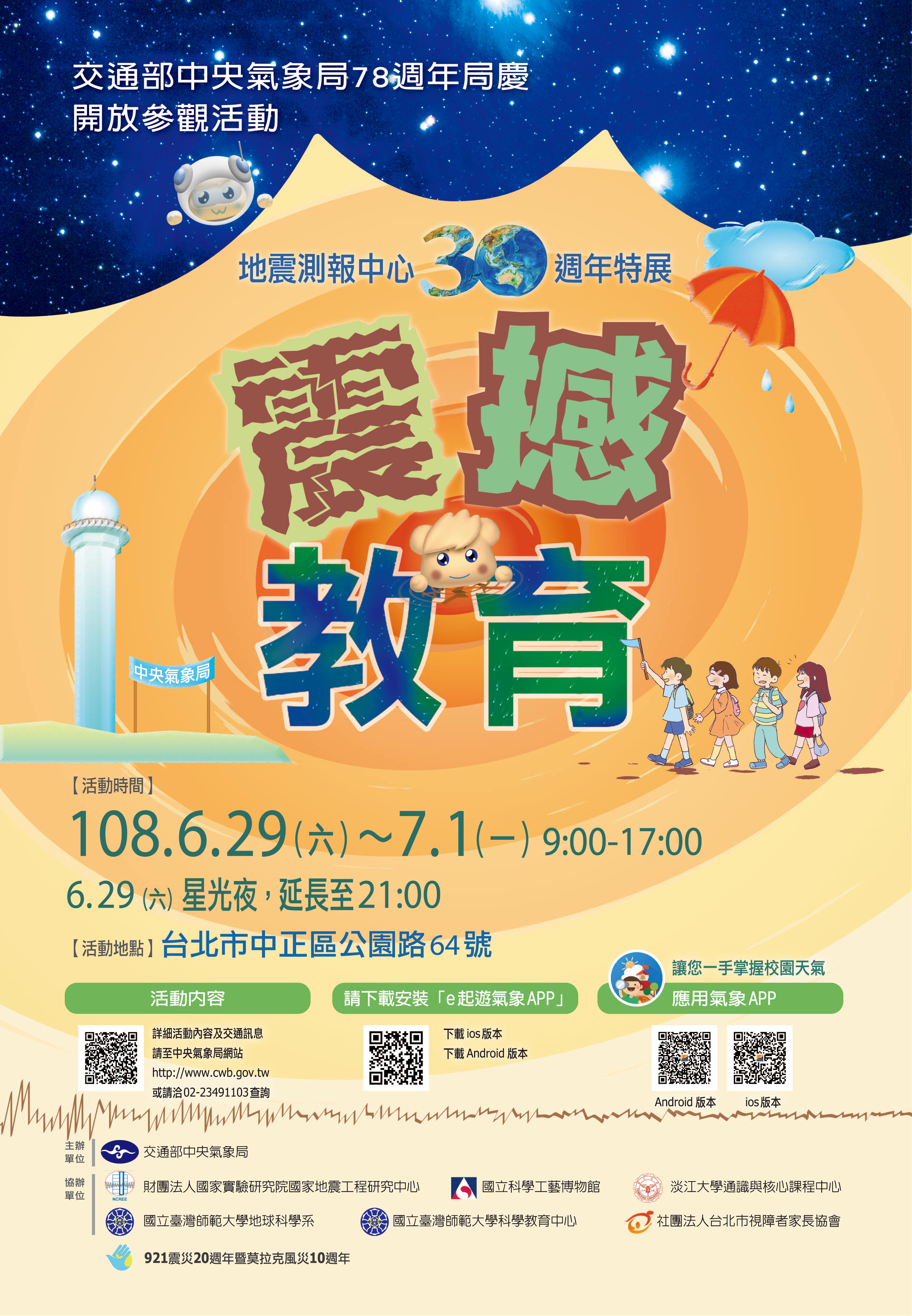 交通部中央氣象局訂於108年6月29日至7月1日,假該局(台北市中正區公園路64號)舉辦78週年局慶開放參觀「震撼教育-地震測報中心30週年特展」,詳情請參考附件海報,有興趣的同仁可利用假日自行前往參觀。