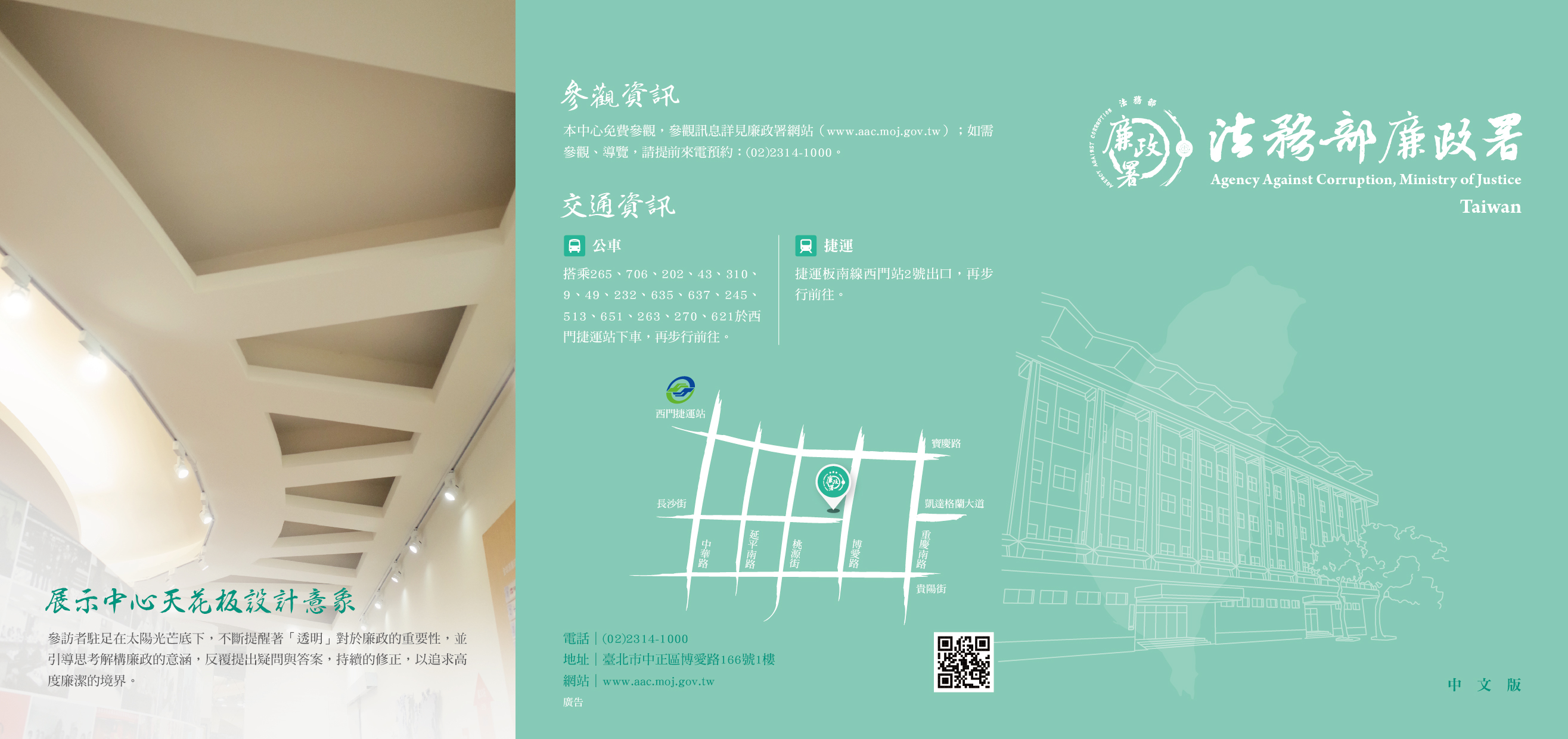 1. 為利大眾認識我國廉政制度,法務部廉政署展示中心免費對外開放參觀,凡有興趣參觀之國內機關團體、學校或一般民眾皆可自行至廉政署網站(http://www.aac.moj.gov.tw)瀏覽參觀資訊並提出申請。