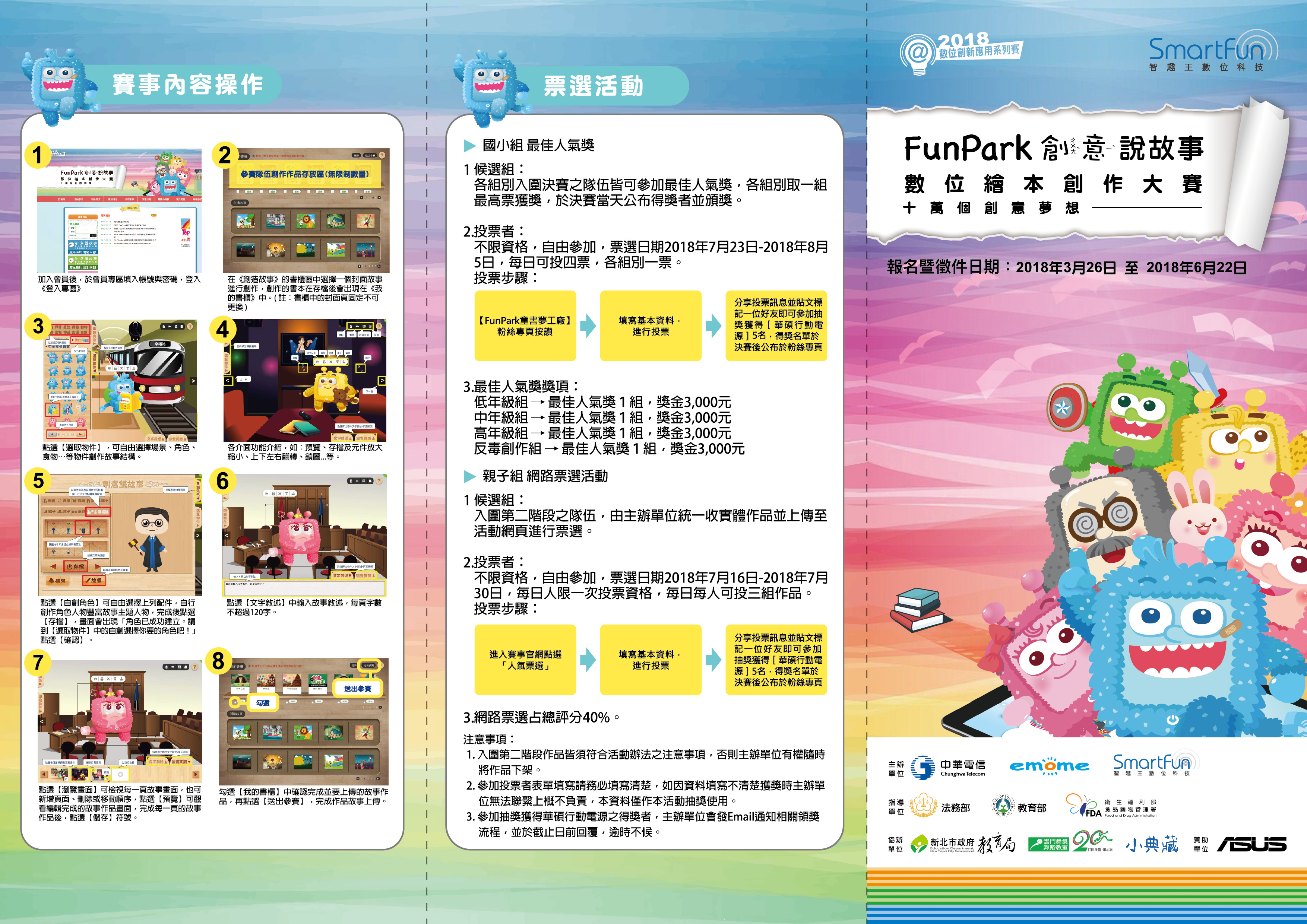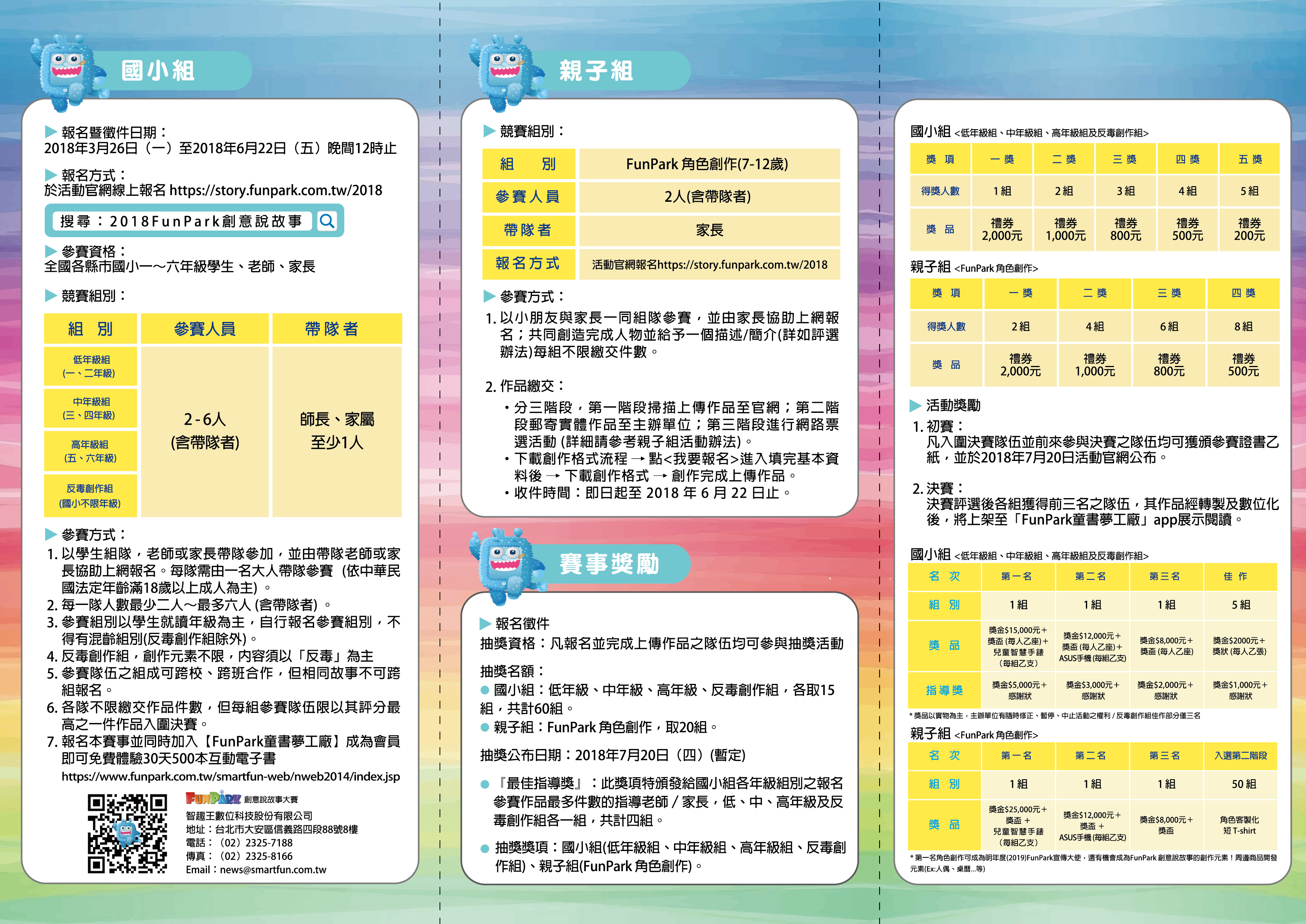 一、法務部結合智趣王數位科技股份有限公司辦理2018第六屆「FunPark創意說故事-數位繪本創作大賽」活動,為鼓勵學生充分發揮創意及想像力,在老師或家長的協助指導下共同創造故事,藉由活動提供學生表演舞台與發揮創意機會,培養親子情感與提升數位能力!