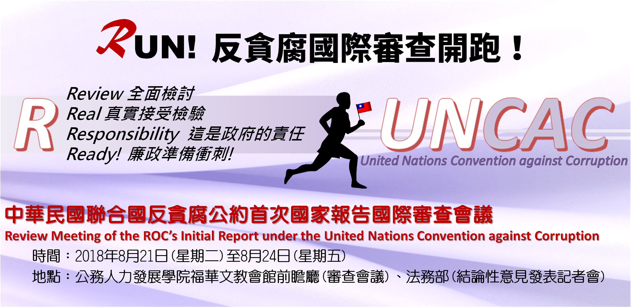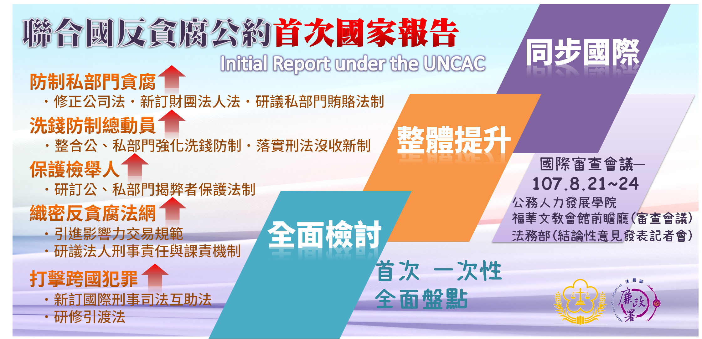 • 我國已完成「聯合國反貪腐公約首次國家報告」,距離10597日公布《聯合國反貪腐公約》,歷時1年餘,結合行政院、司法院、考試院、監察院及其所屬共計27個機關,全盤檢討我國落實《聯合國反貪腐公約》之現況,經過21場次的國內審查及定稿會議,順利完成首次國家報告。國家報告已公布於廉政署網站「聯合國反貪腐公約專區」(下載網頁:https://www.aac.moj.gov.tw/ct.asp?xItem=507288&ctNode=46214&mp=289)。